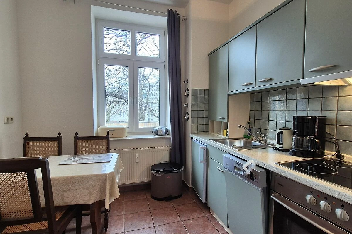 Diese charmante 2-Zimmer-Ferienwohnung (50 m²) im 1. Obergeschoss bietet alles, was Sie für einen erholsamen Aufenthalt brauchen. Der gemütliche Wohnbereich mit bequemer Couch und TV lädt zum Entspannen ein – und von hier aus gelangen Sie direkt auf den sonnigen Balkon mit Gartenmöbeln. Genießen Sie den Blick auf die Heinrich-Heine-Straße in Richtung Kurpark und Promenade – ideal, um das Treiben zu beobachten oder den Tag bei einem Glas Wein ausklingen zu lassen.