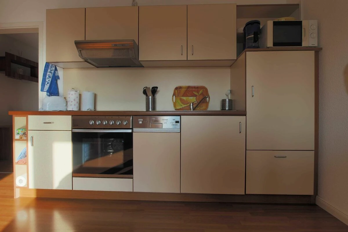 Die offene Küchenzeile ist komplett ausgestattet und bietet alles, was Sie für die Zubereitung Ihrer Mahlzeiten benötigen. Am großzügigen Esstisch finden bis zu vier Personen bequem Platz. Im separaten Schlafzimmer sorgt ein komfortables Doppelbett, ein großer Kleiderschrank und praktische Verdunkelungsjalousien für erholsamen Schlaf. Das moderne Badezimmer verfügt über eine Dusche und rundet das durchdachte Raumkonzept ab.