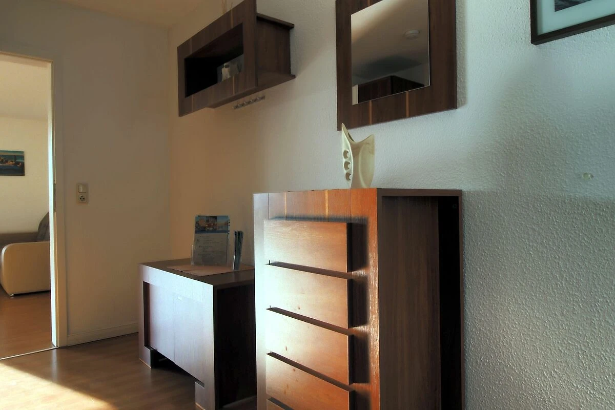 Die gemütliche 2-Zimmer-Ferienwohnung mit Westbalkon befindet sich im 1. Obergeschoss und ist ideal für zwei Personen geeignet – bietet aber auch Platz für bis zu vier Gäste. Der helle Wohnbereich lädt mit einem bequemen Sofa und TV zum Entspannen ein; das Sofa lässt sich bei Bedarf ganz einfach in ein Schlafsofa für zwei weitere Personen verwandeln. Vom Wohnzimmer aus gelangen Sie direkt auf den sonnigen Balkon, der mit Gartenmöbeln ausgestattet ist – perfekt für ein Frühstück im Freien oder entspannte Abende in der Abendsonne.