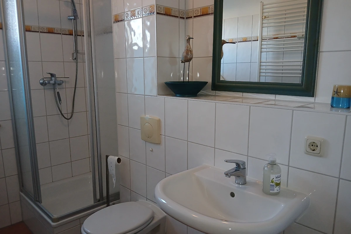Das moderne Bad bietet neben einer Dusche auch einen Haartrockner.