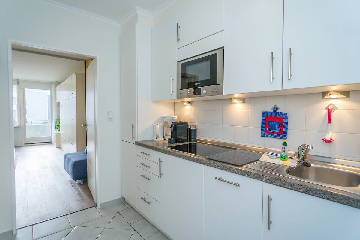 Die Küchenzeile hat einen Geschirrspüler, ein 4-Platten-Ceranfeld und eine Mikrowelle.
