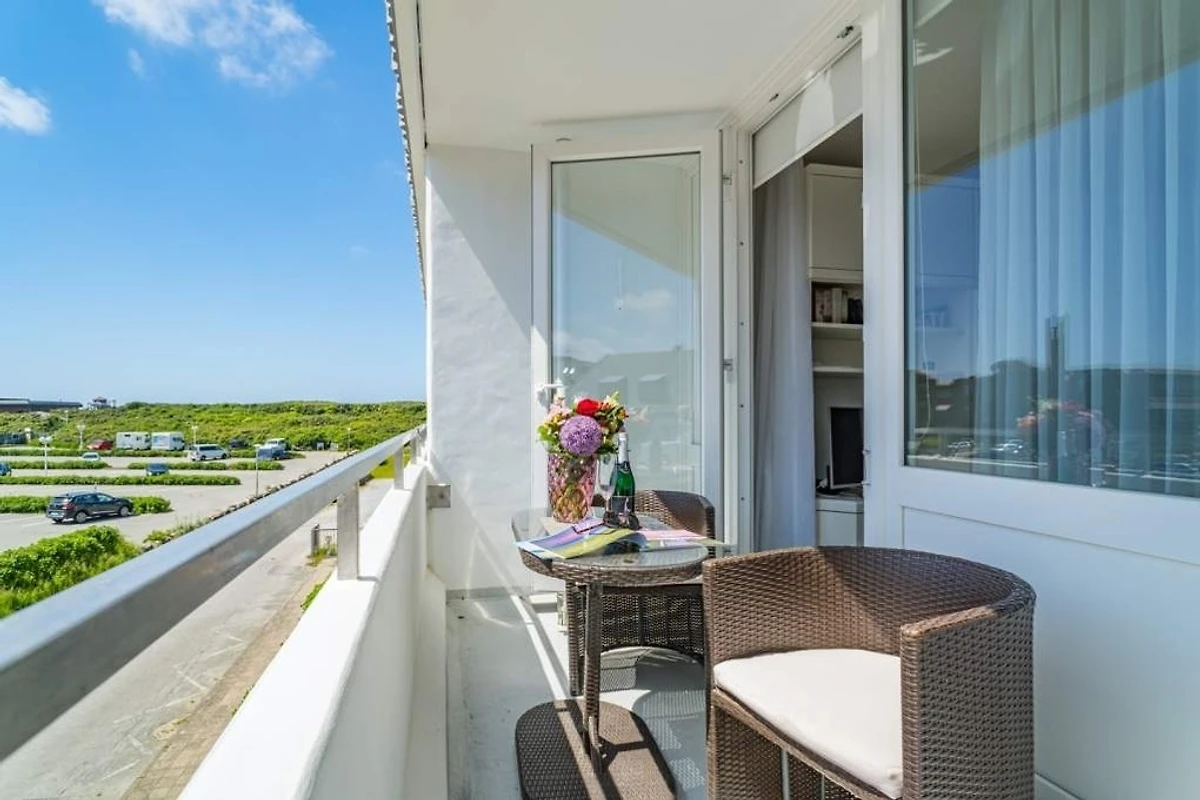 Die helle 1-Zimmer-Ferienwohnung, ca. 40 qm, befindet sich in der zweiten Etage des Hauses und ist mit Südloggia (Sonnenseite, mit Balkonmöbeln und Auflagen) nach Süden ausgerichtet.
