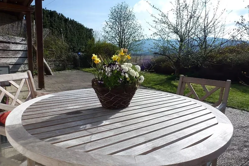 Von der grosszügigen Terrasse mit angrenzender Liegewiese haben Sie einen freien Blick aufs Murnauer Moos und Wettersteingebirge.