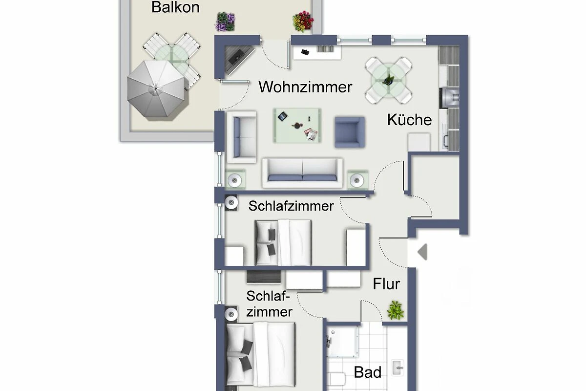 Vom Wohnbereich aus gelangst du auf den nach Nord - Ost ausgerichteten großzügigen Balkon mit Teilseeblick. Zur Ausstattung gehört selbstverständlich auch ein Flachbild-TV.