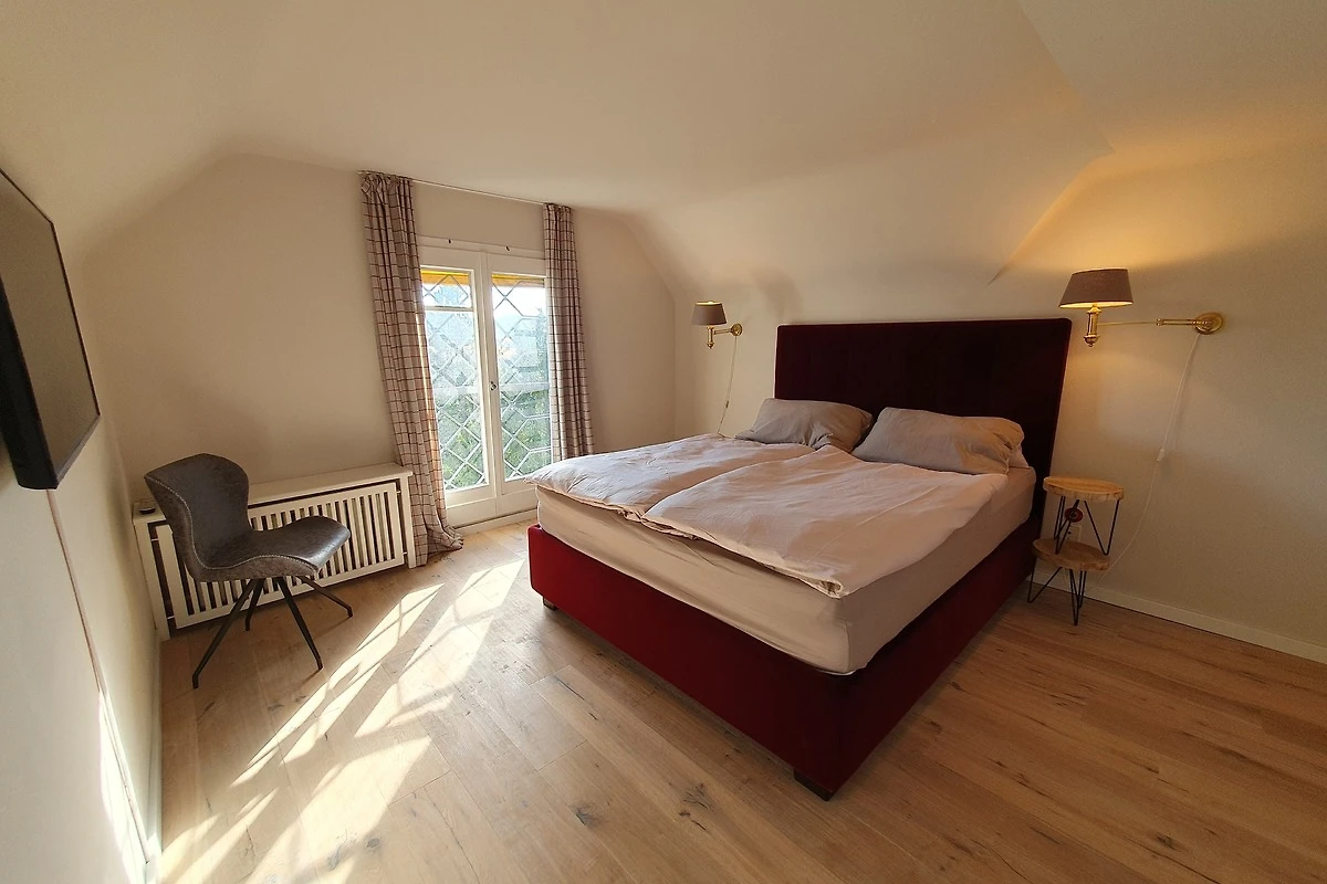 Das Ferienhaus "Eiche" verfügt über 180 m² Wohnfläche. Im lichtdurchfluteten Erdgeschoss befinden sich ein grosszügiger Eingangsbereich, das Wohnzimmer mit offenem Kamin, das Esszimmer und die modern und hochwertig eingerichtete Küche sowie ein Gäste-WC. Im Obergeschoss befinden sich 3 Schlafzimmer und ein kleines abgetrenntes Kinderschlafzimmer (Bett 80x160cm). Die Betten in den Schlafzimmern sind 150x200 cm, 160x200cm und 180x200 cm gross. Zudem sind im Obergeschoss 2 modern gestaltete Bäder mit Dusche und WC vorhanden. Zu dem Ferienhaus "Eiche" gehört eine Terrasse mit Sitzgelegenheiten und wundervollem Blick sowie eine überdachte Terrasse mit weiterer Sitzmöglichkeit. Das Ferienhaus ist über Treppen bzw. einen geschwungenen Pfad zu erreichen und ist nicht barrierefrei.