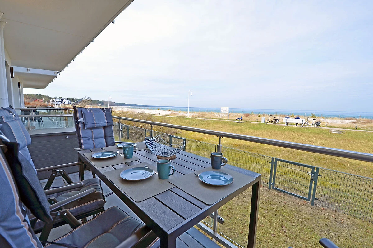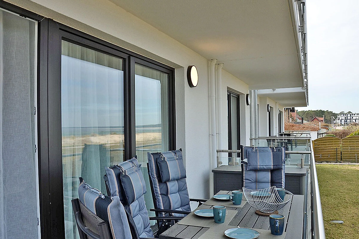 Außenbereich: großer Südbalkon mit Meerblick und Balkonmöbel