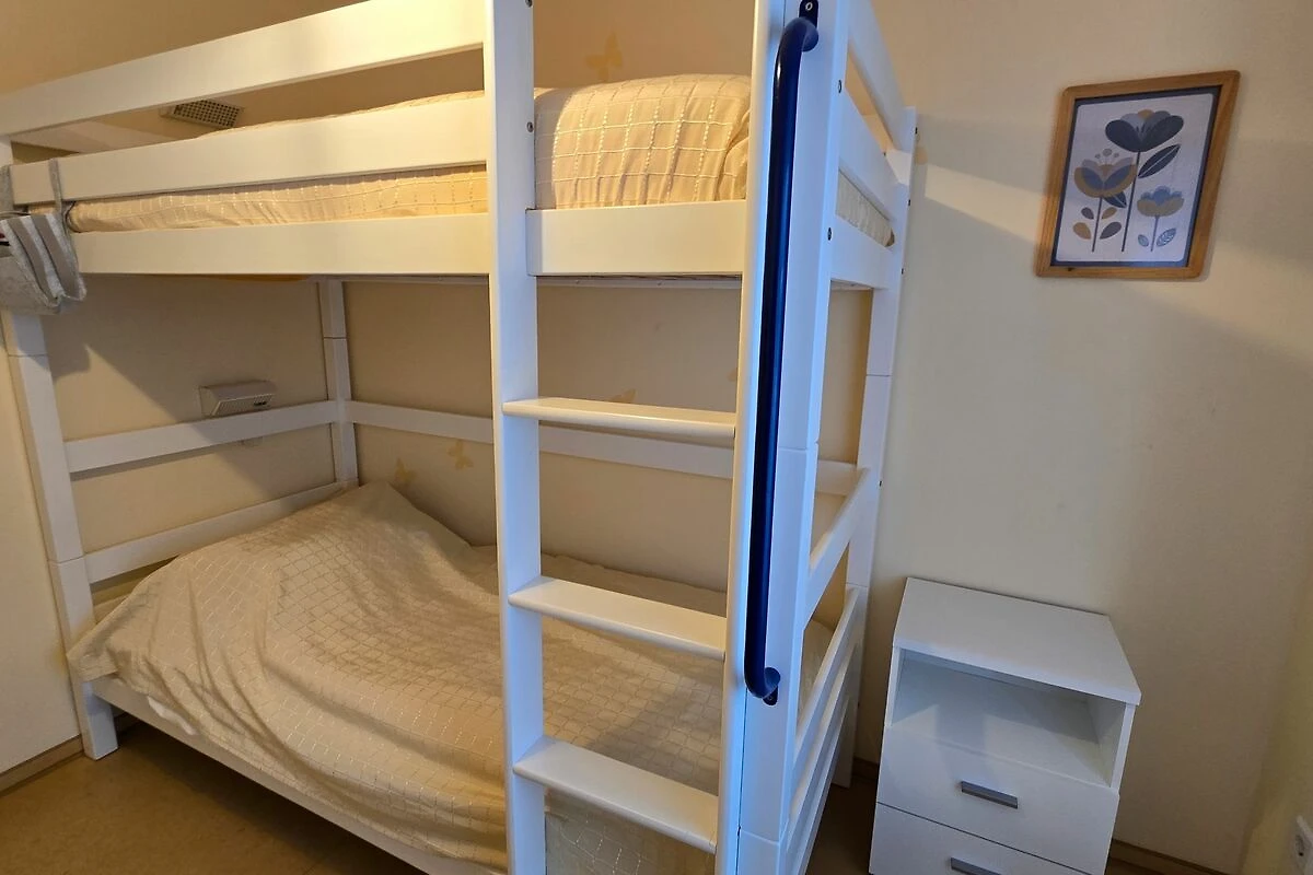Der Wohnbereich ist freundlich gestaltet und lädt zu gemeinsamen Stunden nach einem Tag an der frischen Nordseeluft ein. Die Küche ermöglicht eine unkomplizierte Selbstversorgung während des Aufenthalts. Separate Schlafbereiche sorgen für erholsame Nächte und ausreichend Rückzugsmöglichkeiten.