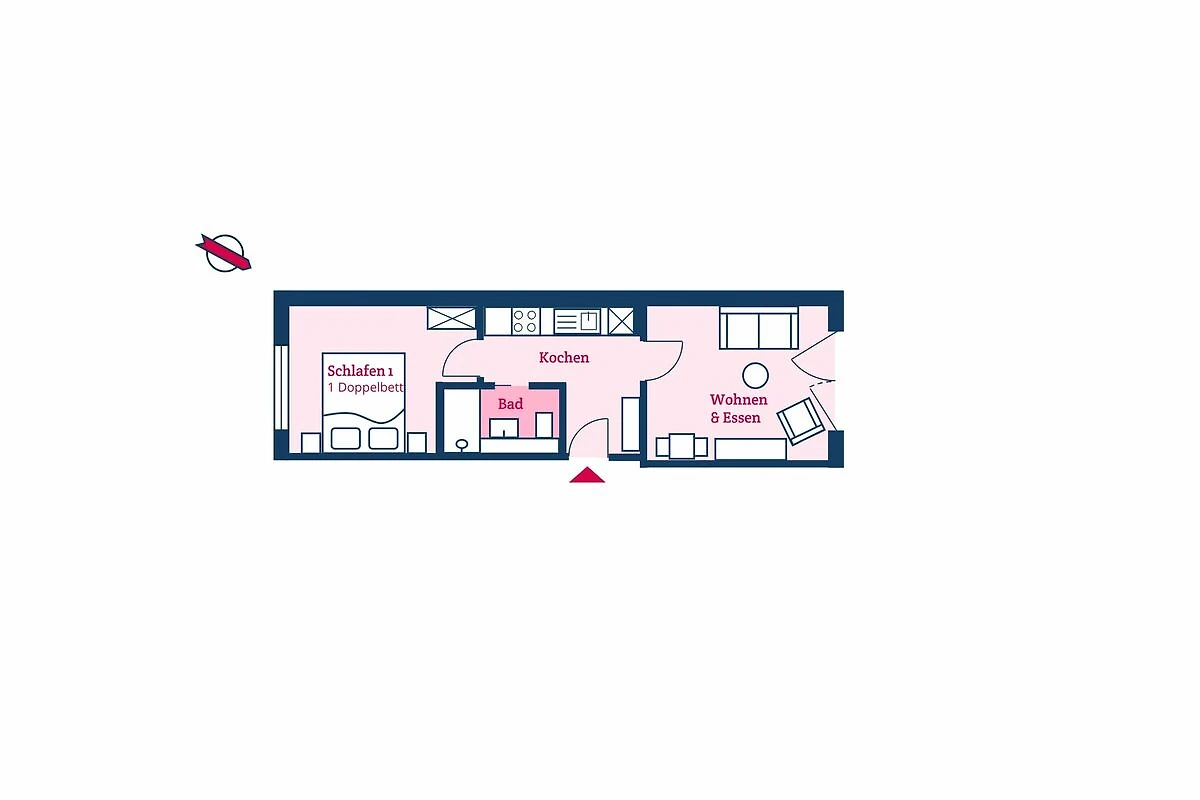 Die Ferienwohnung liegt vollständig im Erdgeschoss und verfügt über ein gemütliches Wohnzimmer, Küche, ein Schlafzimmer mit Doppelbett sowie ein Bad mit komfortabler Raindance-Dusche. Die große Couch im Wohnzimmer lässt sich zu einem weiteren Schlafplatz ausklappen, so dass bei Bedarf zwei getrennte Schlafmöglichkeiten zur Verfügung stehen. Vom Wohnzimmer gelangen Sie direkt auf Ihre private kleine Terrasse.