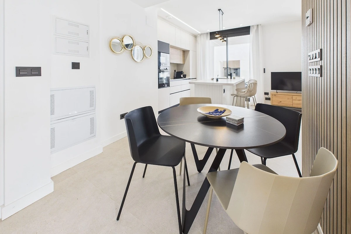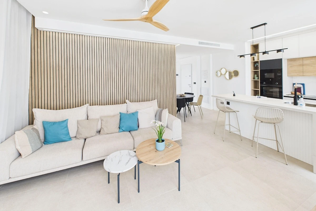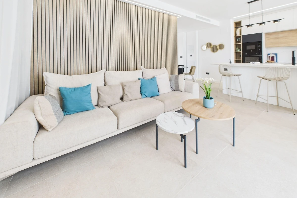 Wohn- und Essbereich: Der Wohnbereich ist mit modernen Möbeln ausgestattet und eignet sich perfekt zum Entspannen nach einem Tag in der Sonne. Er geht nahtlos in die voll ausgestattete Küche über, in der Sie hochwertige Geräte, eine Kaffeestation und alles Notwendige für ein perfektes Abendessen finden. Oder entspannen Sie sich auf unserem bequemen Sofa, das sich perfekt für Filmabende auf dem Smart-TV eignet. Ob Sie Ihre Lieblingssendungen streamen oder die Nachrichten verfolgen, dies ist der ideale Ort, um neue Energie zu tanken.