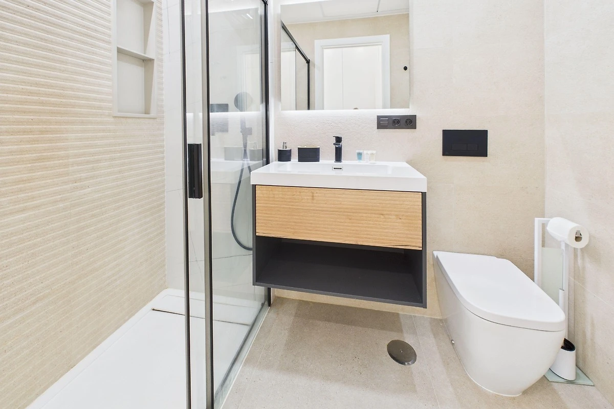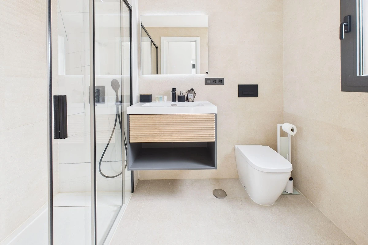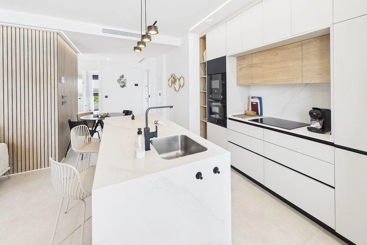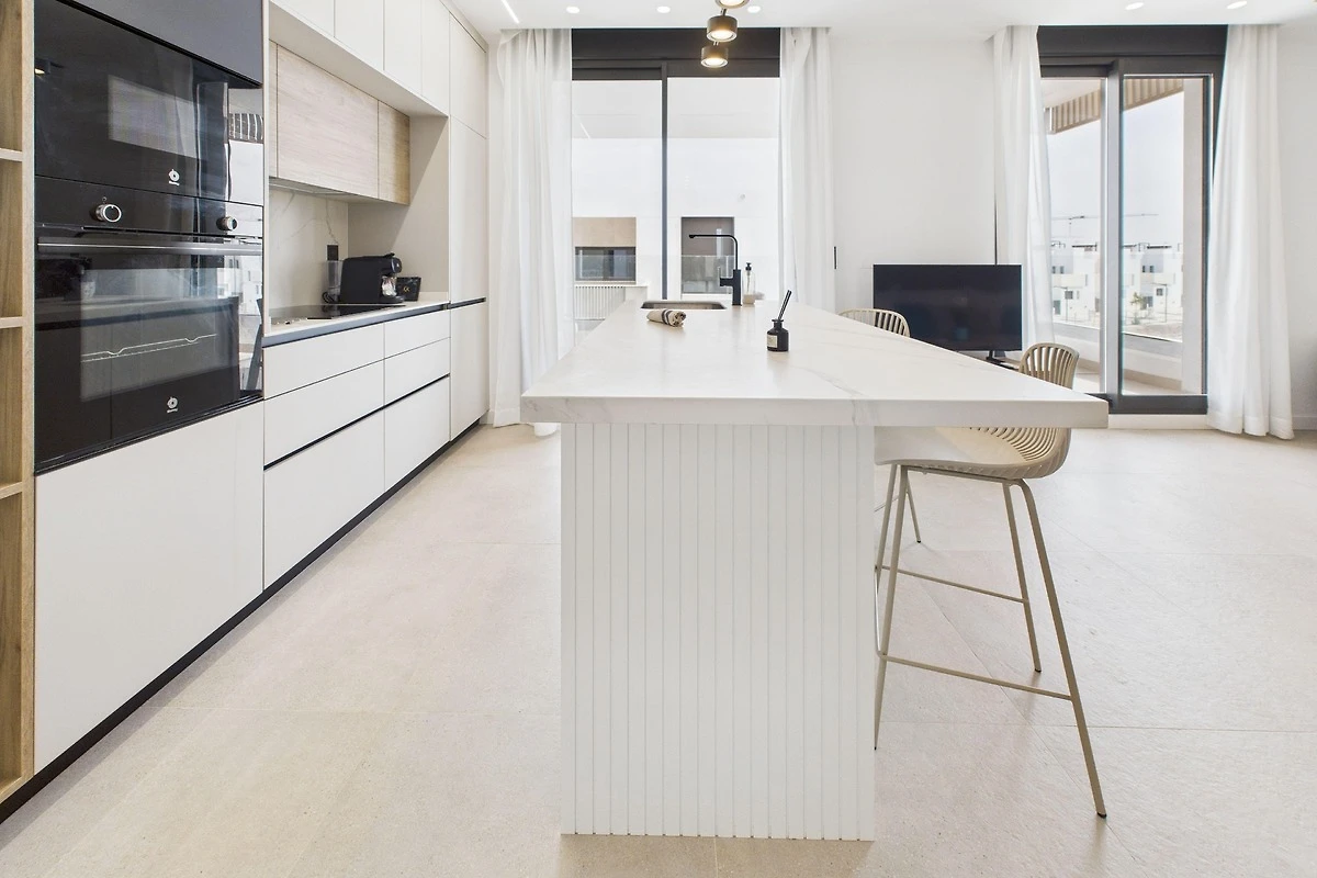 Wohn- und Essbereich: Der Wohnbereich ist mit modernen Möbeln ausgestattet und eignet sich perfekt zum Entspannen nach einem Tag in der Sonne. Er geht nahtlos in die voll ausgestattete Küche über, in der Sie hochwertige Geräte, eine Kaffeestation und alles Notwendige für ein perfektes Abendessen finden. Oder entspannen Sie sich auf unserem bequemen Sofa, das sich perfekt für Filmabende auf dem Smart-TV eignet. Ob Sie Ihre Lieblingssendungen streamen oder die Nachrichten verfolgen, dies ist der ideale Ort, um neue Energie zu tanken.