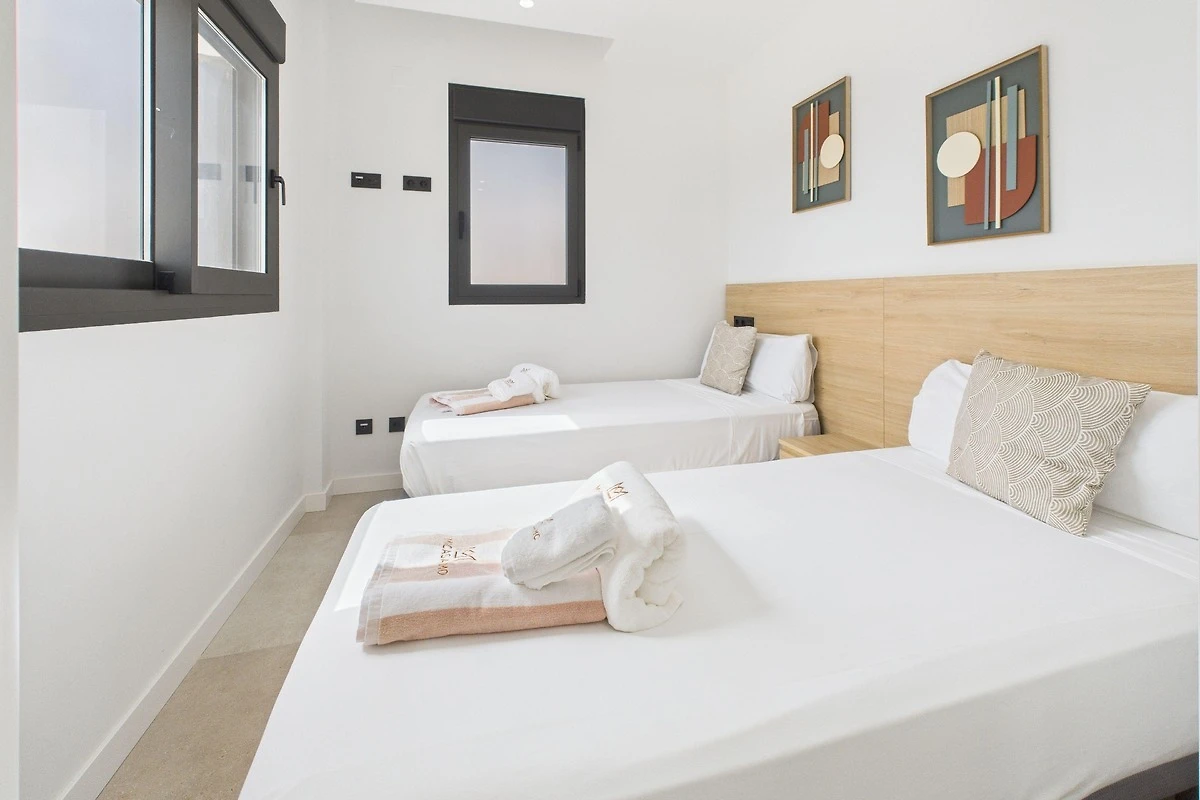Die Master-Suite verfügt über ein bequemes Kingsize-Bett und ein eigenes Bad. Das zweite Schlafzimmer ist ebenso stilvoll, verfügt über 2 Einzelbetten, die leicht zu einem Doppelbett umgebaut werden können, und wird von einem zweiten Badezimmer mit Badewanne bedient, was es ideal für Familien oder zwei Paare macht.