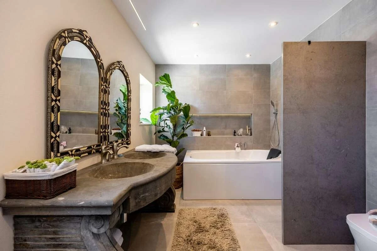 Während der Innenbereich ganz der Entspannung gewidmet ist, stehen Ihnen die weitläufigen Außenbereiche zur Verfügung. Sie haben vollen Zugang zum Swimmingpool, der sonnigen Poolterrasse und dem üppigen Garten. Für Ihre kulinarischen Genüsse können Sie den Grillplatz und die Außenküche mit gemütlichen Sitzgelegenheiten nutzen – perfekt für Mahlzeiten unter freiem Himmel. Bitte beachten Sie, dass keine Mikrowelle vorhanden ist.