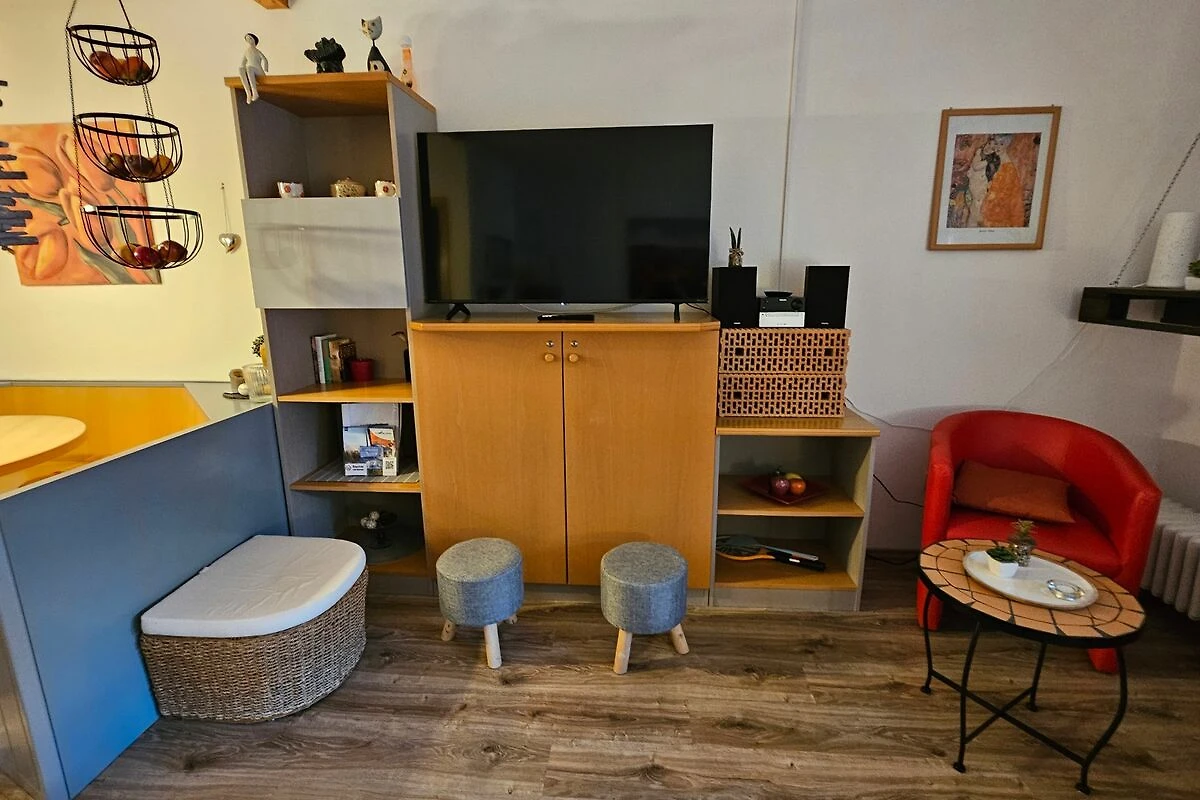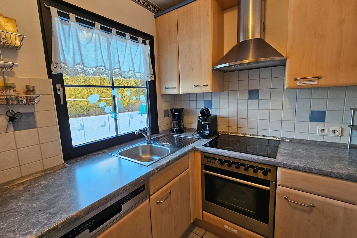 Die geschlossene Küche ist voll ausgestattet und lässt keine Wünsche offen: Cerankochfeld, Backofen, Mikrowelle, Geschirrspüler, Kühlschrank mit Gefrierfach, Kaffeemaschine sowie eine Kapselmaschine, Wasserkocher und Toaster. Geschirr und Besteck sind selbstverständlich ebenfalls vorhanden, sodass gemeinschaftlichen Mahlzeiten im angrenzenden Essbereich nichts im Wege steht. Neben einer Garderobe sorgen eine Kommode sowie ausreichend Stauraum für Komfort. Im Badezimmer erwartet Sie eine moderne Dusche sowie Waschbecken, WC, Fenster und ein Haartrockner.
