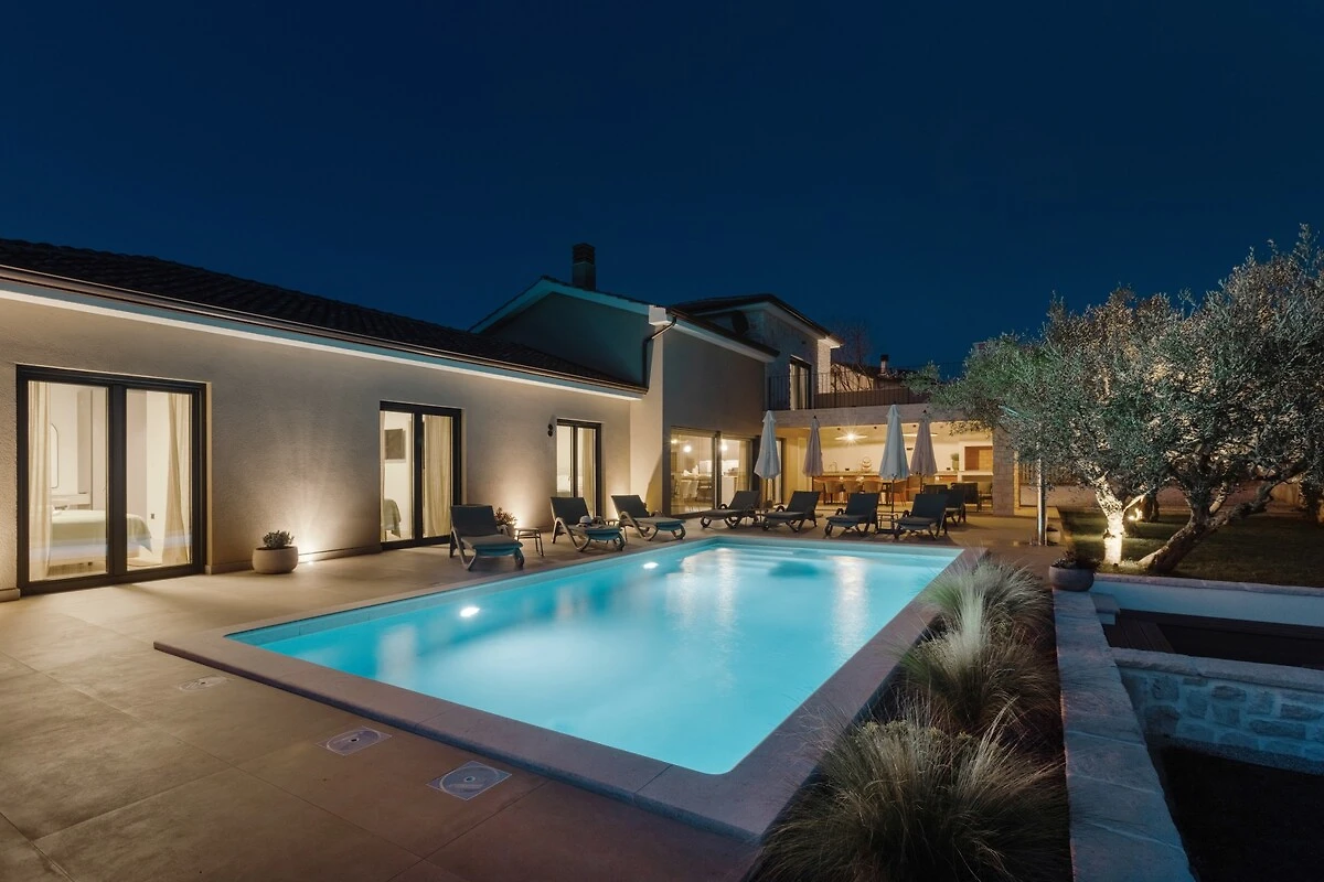Willkommen in der Villa Noor in Kaštelir, Istrien – Ihrem idealen Rückzugsort für unvergessliche Urlaubstage mit Familie oder Freunden. Das großzügige Ferienhaus bietet auf 221 m² Platz für bis zu 10 Gäste und überzeugt mit vier komfortablen Schlafzimmern sowie fünf modernen Badezimmern. Genießen Sie entspannte Stunden auf der sonnigen Terrasse oder dem Balkon, während Sie den Blick auf den gepflegten Garten schweifen lassen. Der große Swimmingpool lädt zum Erfrischen ein, rundherum stehen bequeme Sonnenliegen bereit. Für gesellige Abende sorgt der BBQ-Grill, und im privaten Außenbereich finden Sie ausreichend Parkmöglichkeiten.