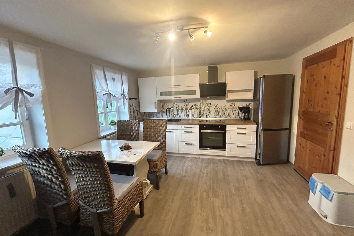 Die separate Küche mit Kaminofen ist vollständig ausgestattet und lässt keine Wünsche offen. Ob ausgiebiges Frühstück oder gemeinsames Kochen – hier finden Sie ausreichend Platz und eine behagliche Atmosphäre, die besonders in den kühleren Jahreszeiten durch den Kaminofen unterstrichen wird.