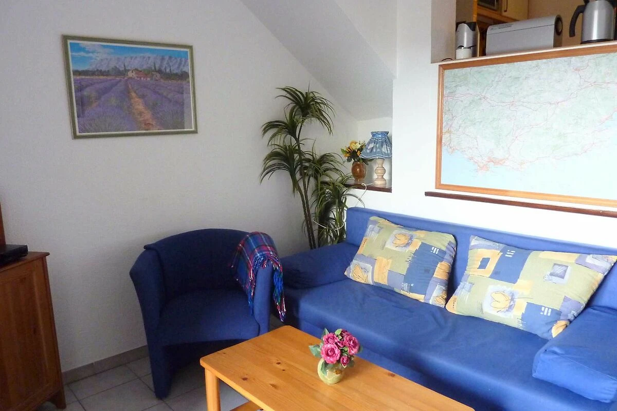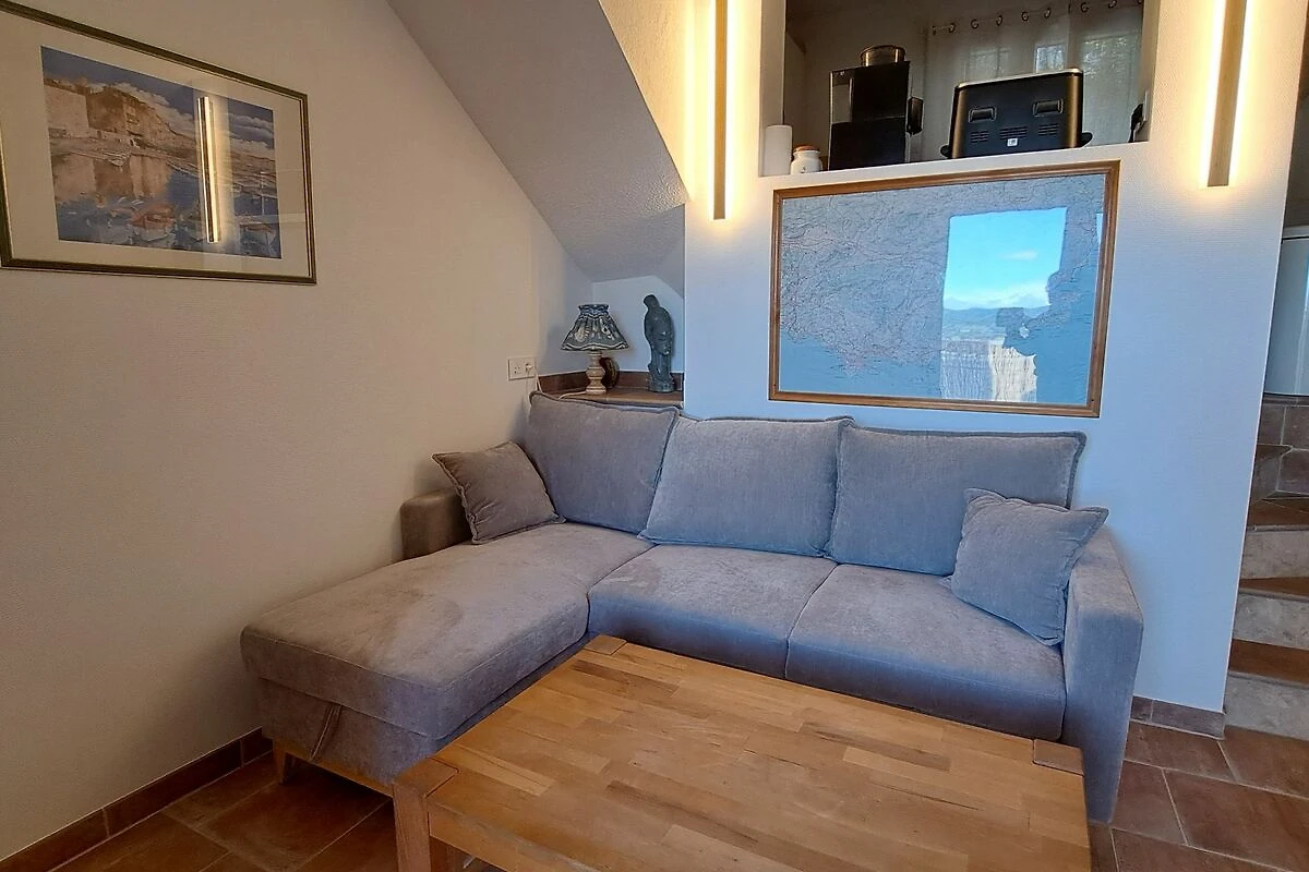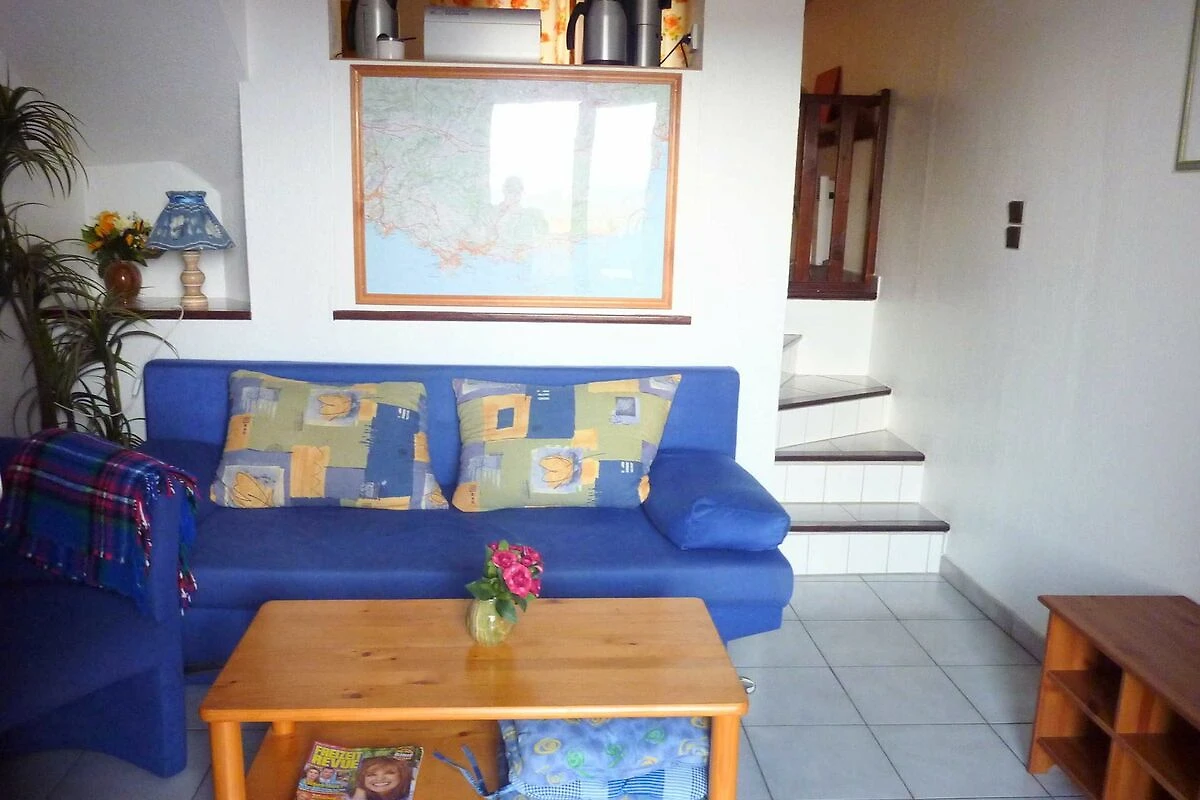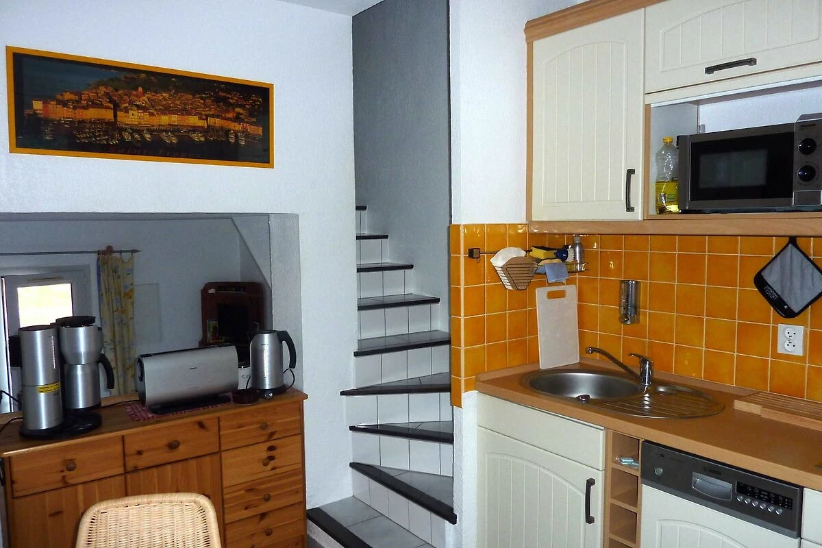 Das Ferienhaus in Frankreich ist auf drei Etagen verteilt. Es bietet Platz für 5 Personen. Im Erdgeschoss befindet sich das Wohnzimmer mit Terrasse und Schlafsofa, auf halber Treppe die Küche mit Essbereich. Im 1. Obergeschoss ein Schlafzimmer und ein Badezimmer und im 2. Obergeschoss ein weiteres Schlafzimmer und ein separates WC.