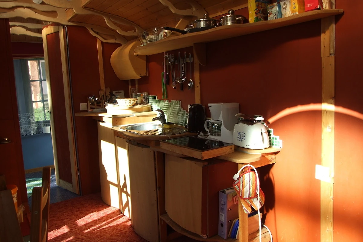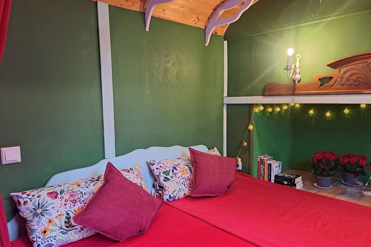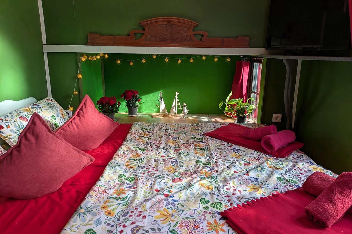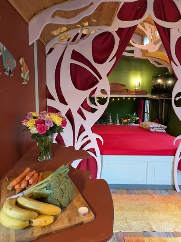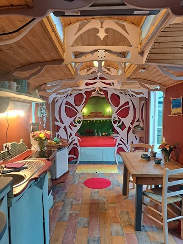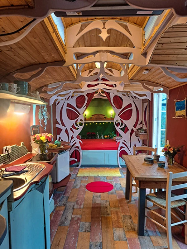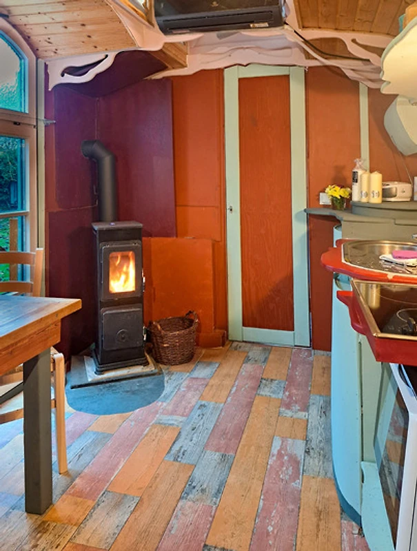 Bunter Drogenrausch in Holz: Innen erwartet euch ein liebevoll – manche würden sagen aggressiv – gestalteter Raum. Der Ausbau ist organisch, nachhaltig und so bunt, dass ihr gar keine andere Wahl habt, als sofort gute Laune zu kriegen. Hier wurde jeder Quadratzentimeter so clever genutzt, dass ihr euch fragt, warum eure eigene Wohnung eigentlich so gross und nutzlos ist.