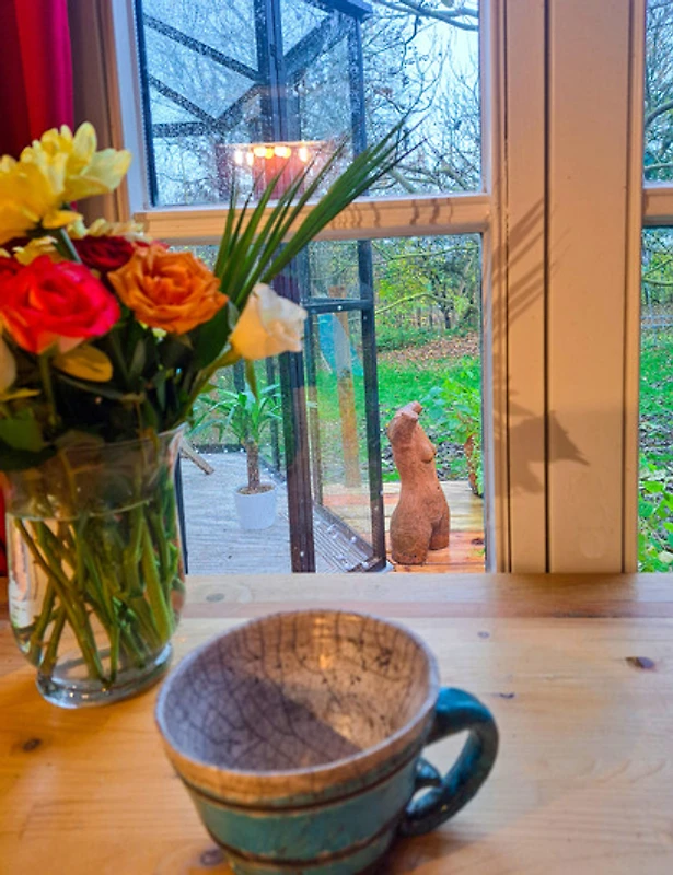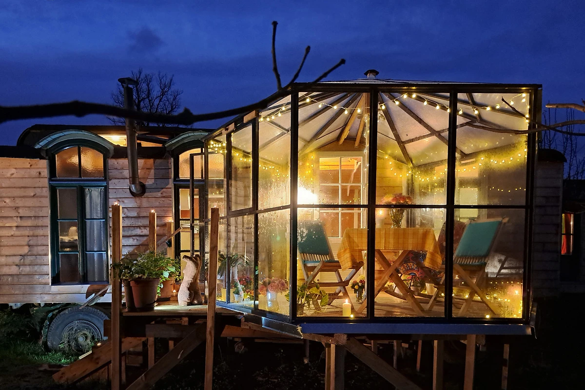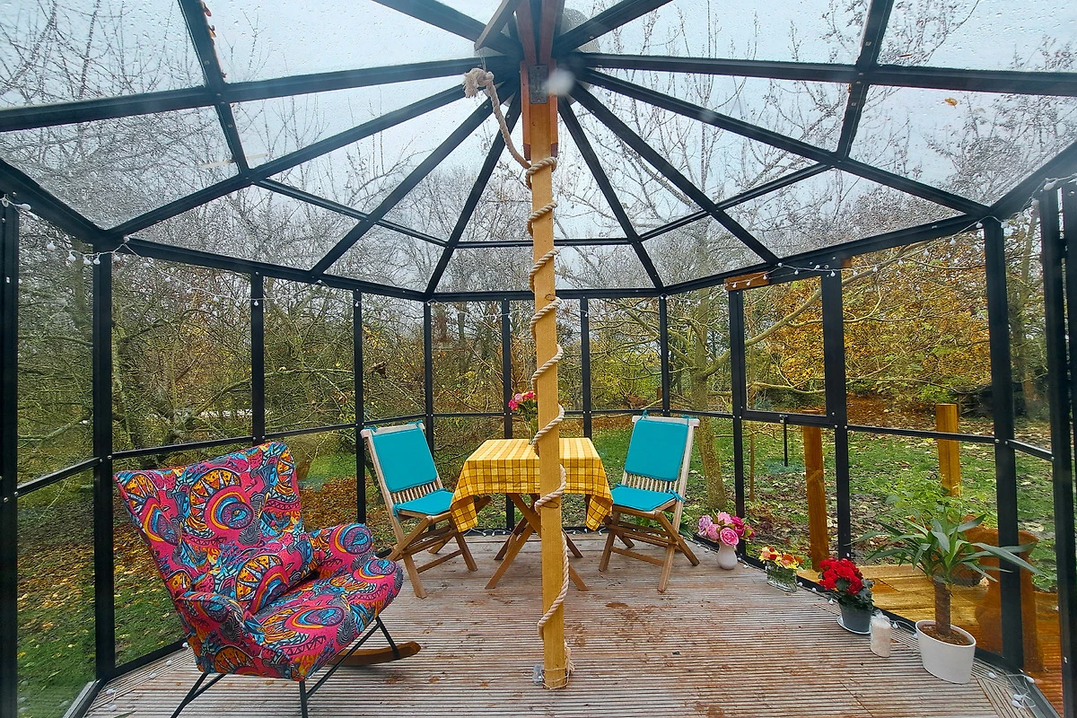 Und dann ist da noch unsere Sternenlounge: ein gläserner Rückzugsort mit Blick ins Grüne – oder nachts direkt in den Himmel. Zugegeben, er ist frisch – nennen wir’s „nordisch klimatisiert“. Aber eingekuschelt mit Tee in der Hand und Sternen überm Kopf fühlt sich das einfach magisch an.