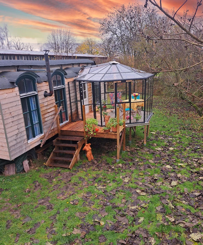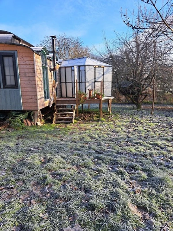 Für Frostbeulen und Wiesen - Voyeur / innen: Vor dem Eingang haben wir einen kalten Wintergarten hingestellt. Ja, er ist kalt, aber er ist der Puffer, damit euch die Kälte nicht direkt umhaut, wenn ihr die Tür aufmacht. Er ist euer Sky Room - Schutzraum und ein charmanter Platz, um das Frühstück bei wunderbarem Blick ins Grüne zu inszenieren - selbst wenn es draussen ungemütlich ist.