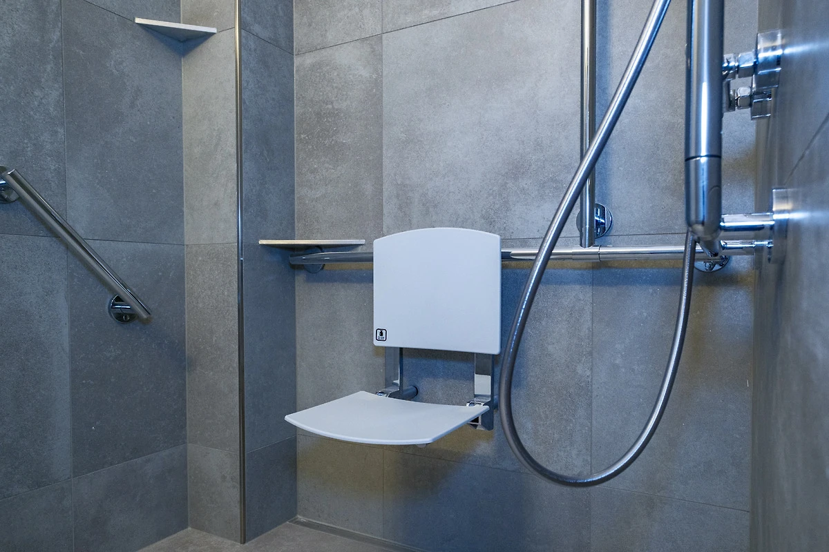 Es ist eine grosszügig eingerichtete und rollstuhlgerechte Ferienwohnung mit eigenem Eingangsbereich, einem Schlafzimmer, einem Badezimmer und einer vollausgestatteten Küche mit Esstisch.