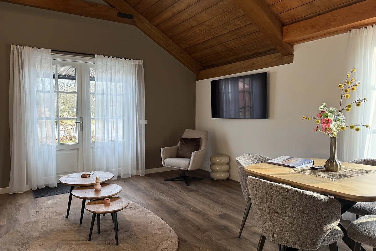 Diese ebenerdige Lodge ist ideal für einen entspannten Aufenthalt mit bis zu 2 Personen. Dank der stimmungsvollen Einrichtung, des hohen Giebels und der warmen Holzakzente entsteht sofort eine gemütliche Atmosphäre. Die Lodge verfügt über ein komfortables Schlafzimmer mit Doppelbett. Das moderne Badezimmer ist mit einer grosszügigen begehbaren Dusche und einer Toilette ausgestattet. Die Luxusküche ist vollständig eingerichtet und mit hochwertigen Geräten ausgestattet, darunter ein Induktionskochfeld, eine Spülmaschine, eine Kombi-Mikrowelle, eine Kühl-Gefrierkombination, ein Quooker sowie eine L’OR Barista Kaffeemaschine. Ob Sie ausgiebig kochen oder in Ruhe eine gute Tasse Kaffee geniessen möchten – alles ist vorhanden. Im Innenbereich geniessen Sie das ganze Jahr über ein angenehmes Raumklima dank Fussbodenheizung und Klimaanlage im Wohnzimmer. Auf dem Smart-TV mit Streaming-Funktionen schauen Sie ganz einfach Ihre Lieblingsserien und -filme. Zudem verfügt die Lodge über kostenloses WLAN und Bettwäsche. Haustiere sind willkommen (maximal 2), und Sie parken bequem direkt neben der Unterkunft. Draussen erwartet Sie der ultimative Entspannungsmoment: Im Garten steht ein elektrischer Hot Tub, in dem Sie vollkommen zur Ruhe kommen. Die grosszügige Terrasse ist mit komfortablen Gartenmöbeln und einem Sonnenschirm ausgestattet. Während Ihres Aufenthalts können Sie ausserdem das beheizte Freibad der Heide Hoeve kostenlos nutzen (saisonal geöffnet). Bitte beachten Sie: Rauchen, Gourmetten und Fondue sind in dieser Unterkunft nicht gestattet. Warum Otterlo?Otterlo liegt im Herzen der Veluwe und ist von Wäldern, Heideflächen und Sandverwehungen umgeben. Ein perfekter Ausgangspunkt für Wander- und Fahrradtouren in der Natur. Der Nationalpark De Hoge Veluwe und das Kröller-Müller-Museum befinden sich in kurzer Entfernung. Hier kommen Ruhe, Natur und Kultur zusammen.