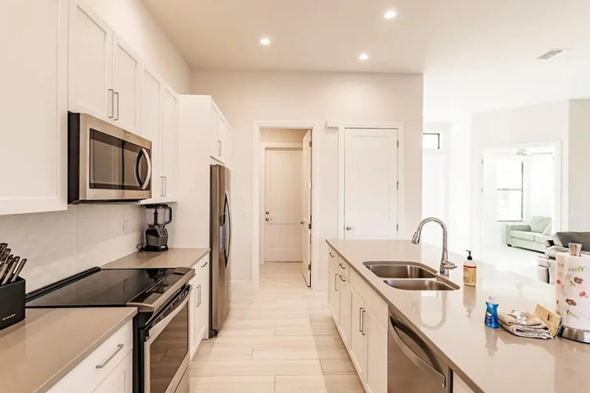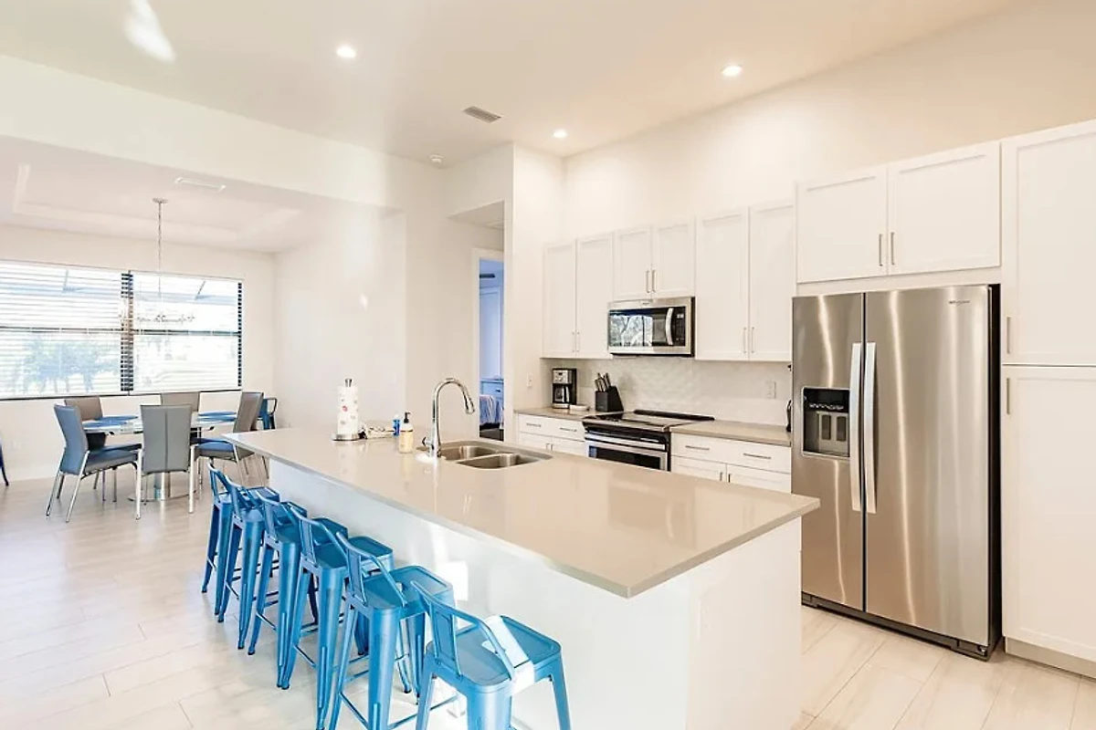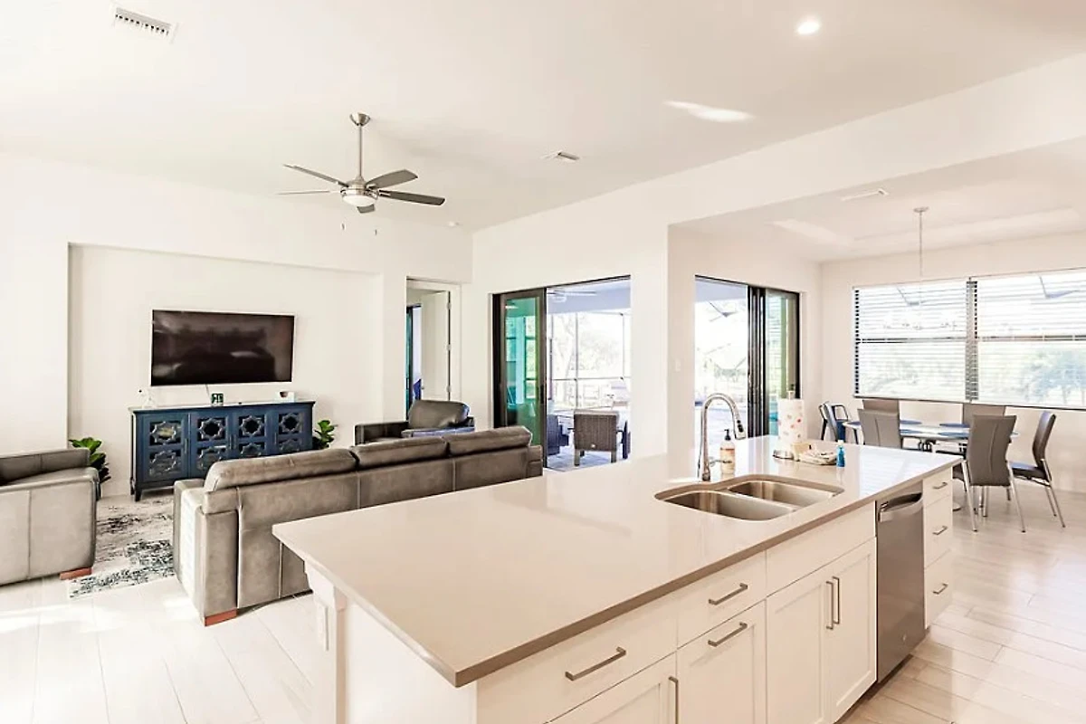 Der Wohnbereich ist offen gestaltet und verbindet gemütliche Sitzmöglichkeiten, stilvolle Einrichtung und viel Tageslicht. Für Musikfans haben wir das Lautsprechersystem der Firma Sonos (WLAN-Speaker) installiert. So können Sie u.a. Ihre heimischen Lieblingsradiosender oder die eigene Playlist über Ihr Mobilgerät im Haus oder Pool Bereich hören. Die moderne Küche lädt dazu ein, gemeinsam zu kochen oder einfach zwischendurch einen frischen Smoothie zu mixen, bevor es wieder hinaus in die Wärme Floridas geht. Ob Sie ein ausgiebiges Frühstück zubereiten (Nespresso Kaffeemaschine vorhanden) oder am Abend ein entspanntes Dinner genießen - diese Küche bietet alles!
