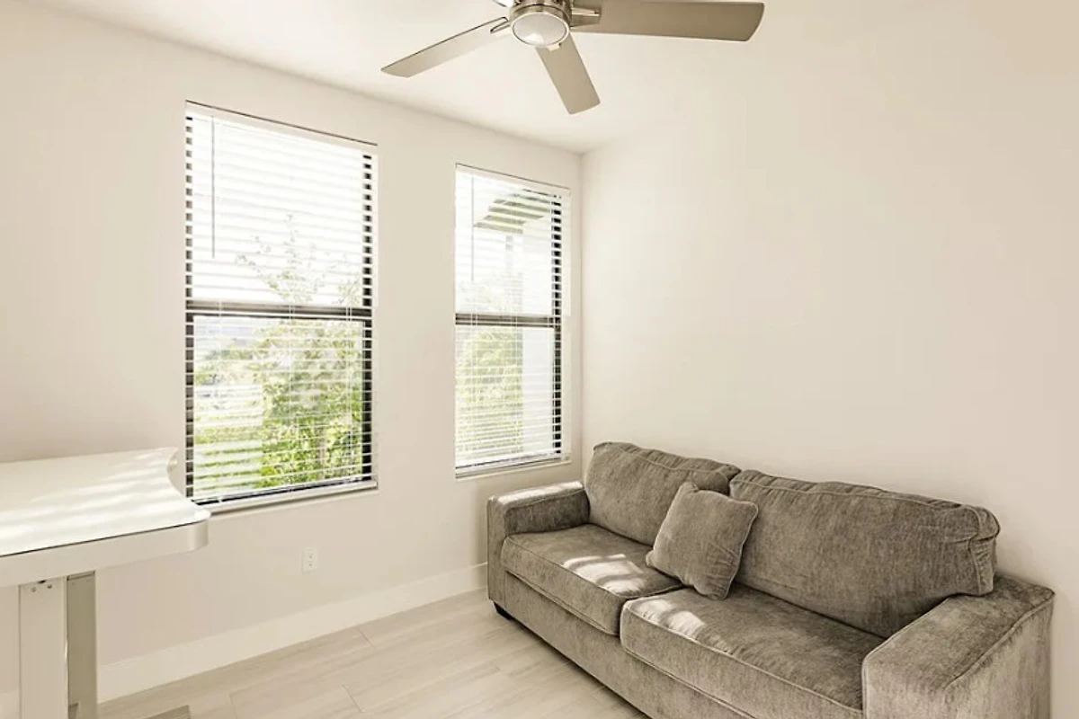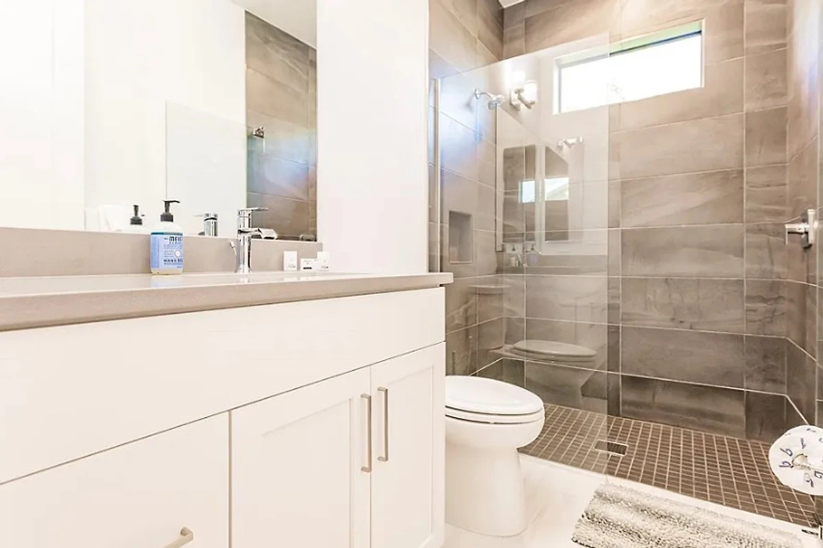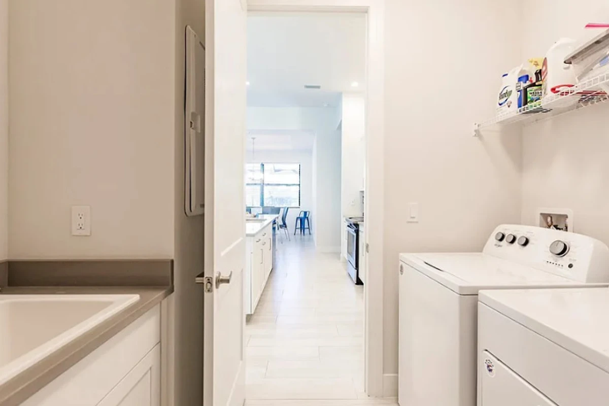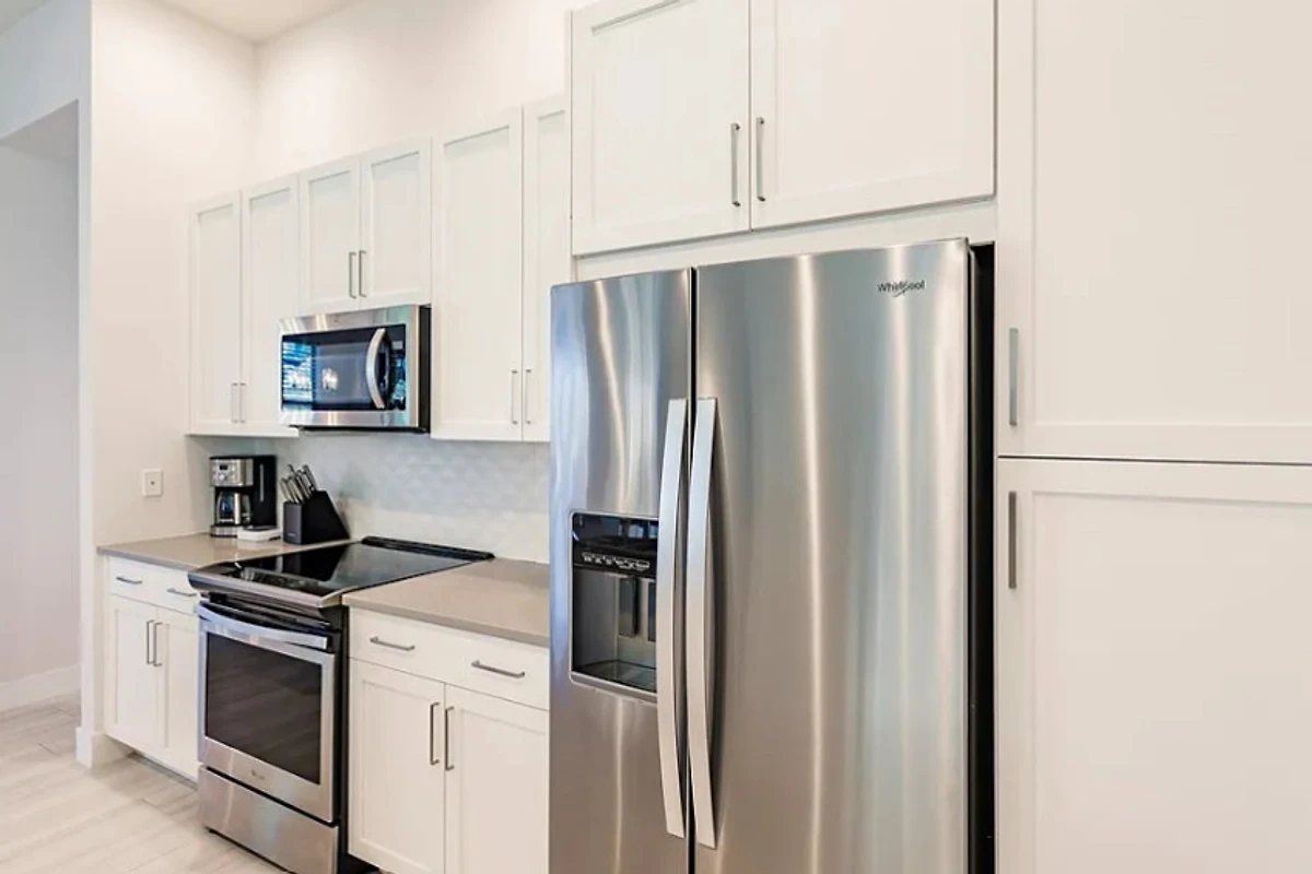 Der Wohnbereich ist offen gestaltet und verbindet gemütliche Sitzmöglichkeiten, stilvolle Einrichtung und viel Tageslicht. Für Musikfans haben wir das Lautsprechersystem der Firma Sonos (WLAN-Speaker) installiert. So können Sie u.a. Ihre heimischen Lieblingsradiosender oder die eigene Playlist über Ihr Mobilgerät im Haus oder Pool Bereich hören. Die moderne Küche lädt dazu ein, gemeinsam zu kochen oder einfach zwischendurch einen frischen Smoothie zu mixen, bevor es wieder hinaus in die Wärme Floridas geht. Ob Sie ein ausgiebiges Frühstück zubereiten (Nespresso Kaffeemaschine vorhanden) oder am Abend ein entspanntes Dinner genießen - diese Küche bietet alles!