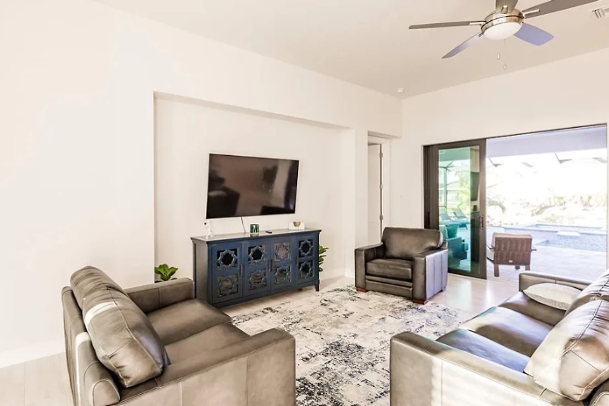Schon beim Betreten spüren Sie den entspannten Florida-Lifestyle: Hohe Decken, eine offene Raumgestaltung und große Fenster, die das helle Tageslicht hereinlassen und den Blick in den Garten mit Pool freigeben. Die Einrichtung verbindet Komfort mit Stil – ideal für Erholung und ganz persönliche Urlaubsmomente.