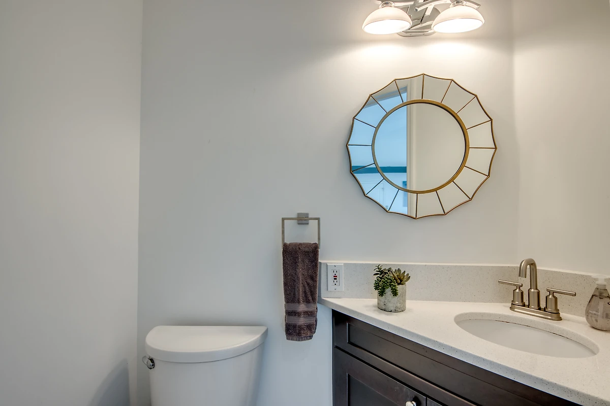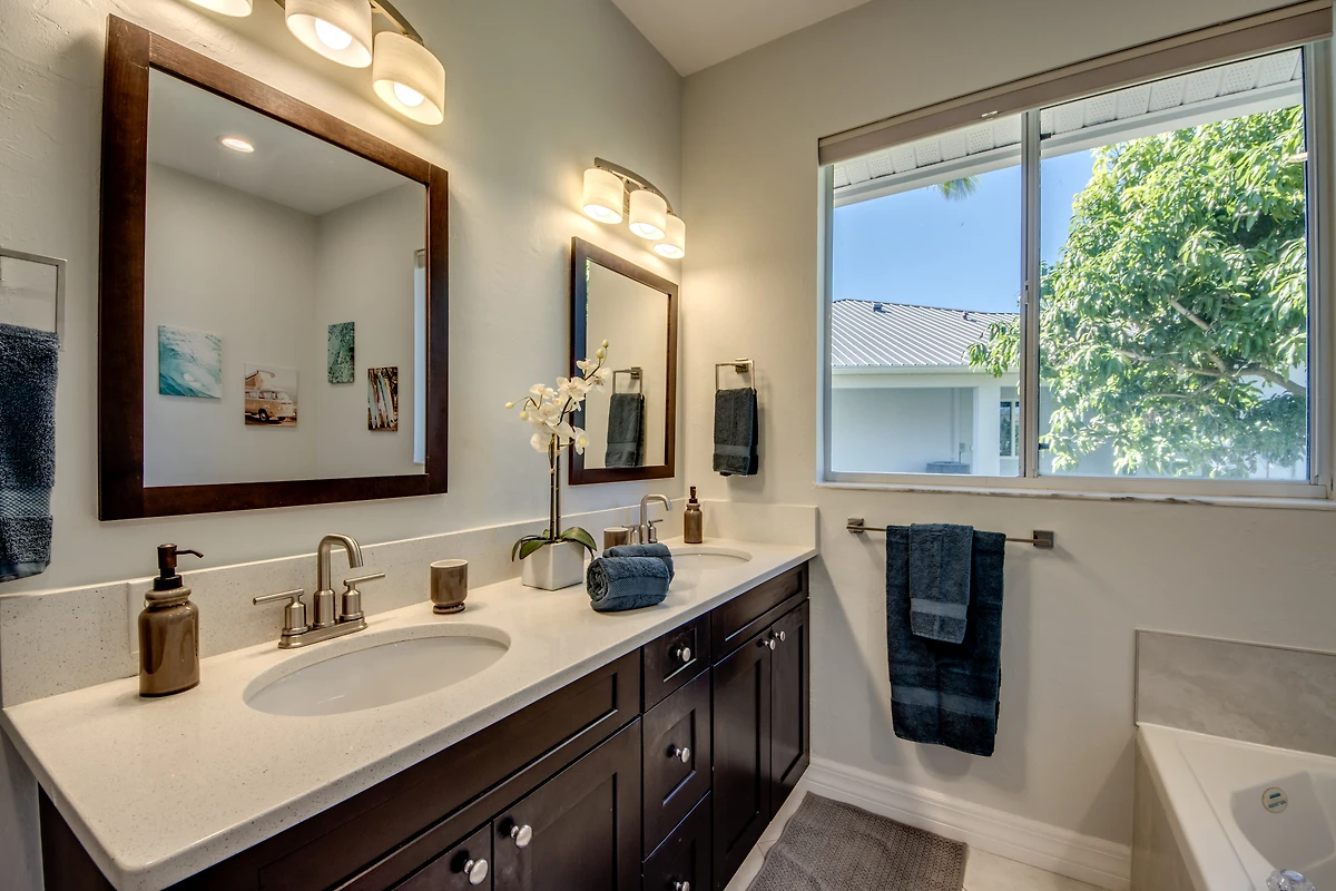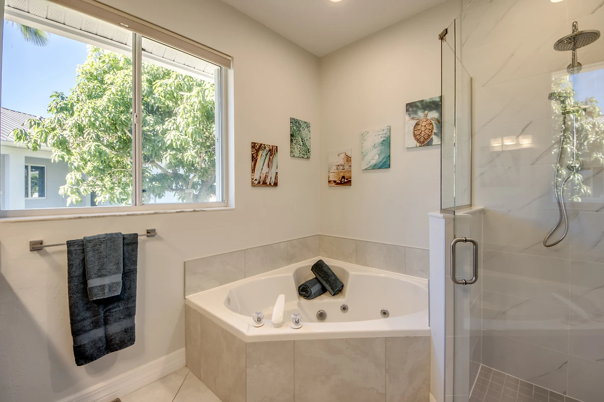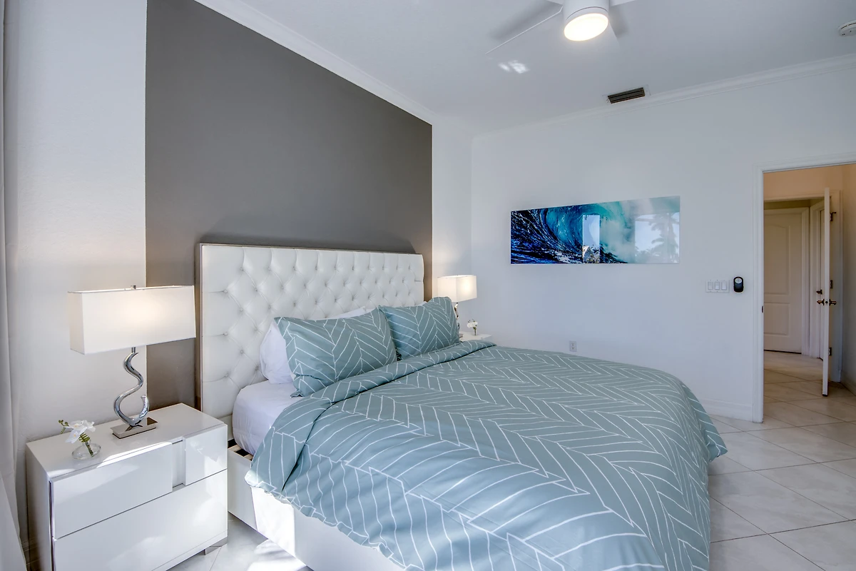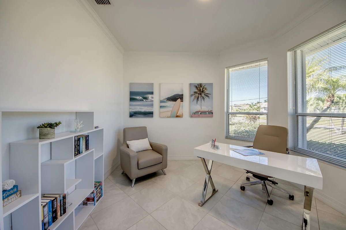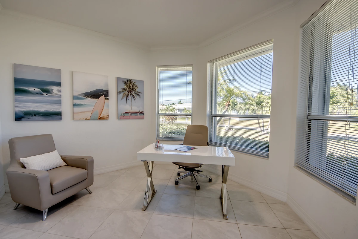 In den drei komfortablen Schlafzimmern findet jeder seinen Rückzugsort. Zwei davon sind mit King Size Betten sowie 50 Zoll Smart TV ausgestattet, das dritte mit einem Queen Size Bett. Es sind zwei volle und ein halbes Badezimmer vorhanden, eines mit Badewanne, eines mit direktem Zugang zum Poolbereich, und ein Gästebad mit Toilette und Waschbecken. Ein separates Büro mit Schreibtisch steht zum arbeiten zur Verfügung.