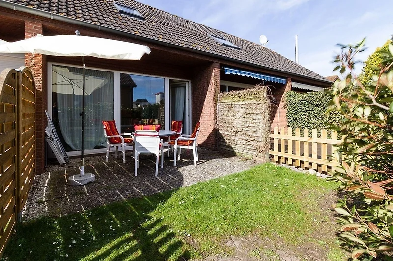 Das Mittelreihenhaus "Mour" bietet einen einladenden Aussenbereich mit einer eingezäunten Terrasse, die sich über zwei Etagen erstreckt und Platz für entspannte Stunden im Freien bietet. Die ruhige Sackgassenlage liegt nur etwa 450 Meter vom Sandstrand entfernt, was ideale Voraussetzungen für Strandbesuche schafft.