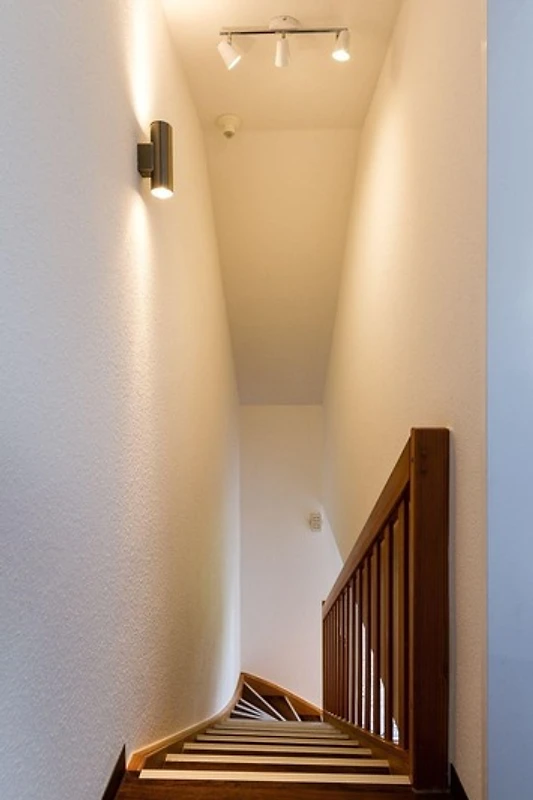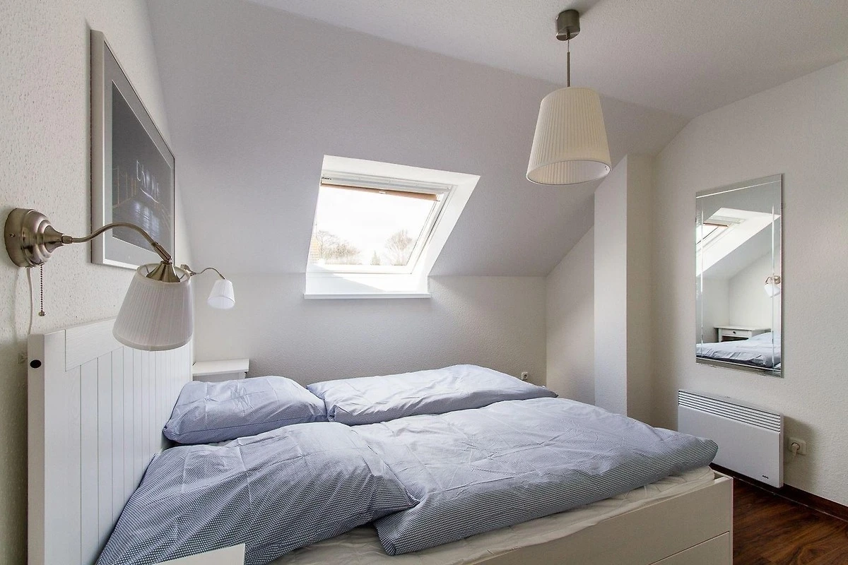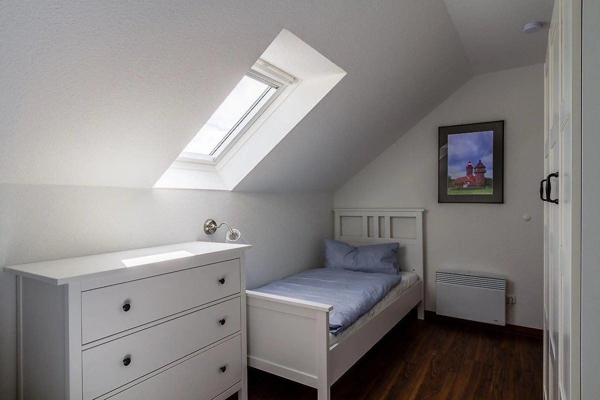 Im Obergeschoss finden sich zwei Schlafzimmer: eines mit einem Doppelbett (2 Matratzen, 90x200 cm) und eines mit zwei Einzelbetten (je 90x200 cm). Beide Schlafräume sind mit Veluxfenstern und Verdunkelungsrollos ausgestattet. Ein Kinderhochstuhl und ein Reisebett stehen bereit, und ein PKW-Stellplatz ist ebenfalls vorhanden. Bettwäsche muss mitgebracht werden. Ein Hund ist gegen Gebühr willkommen.
