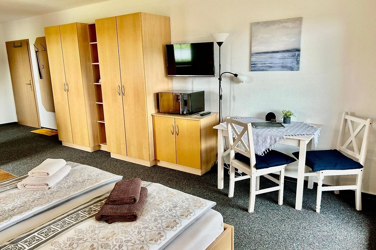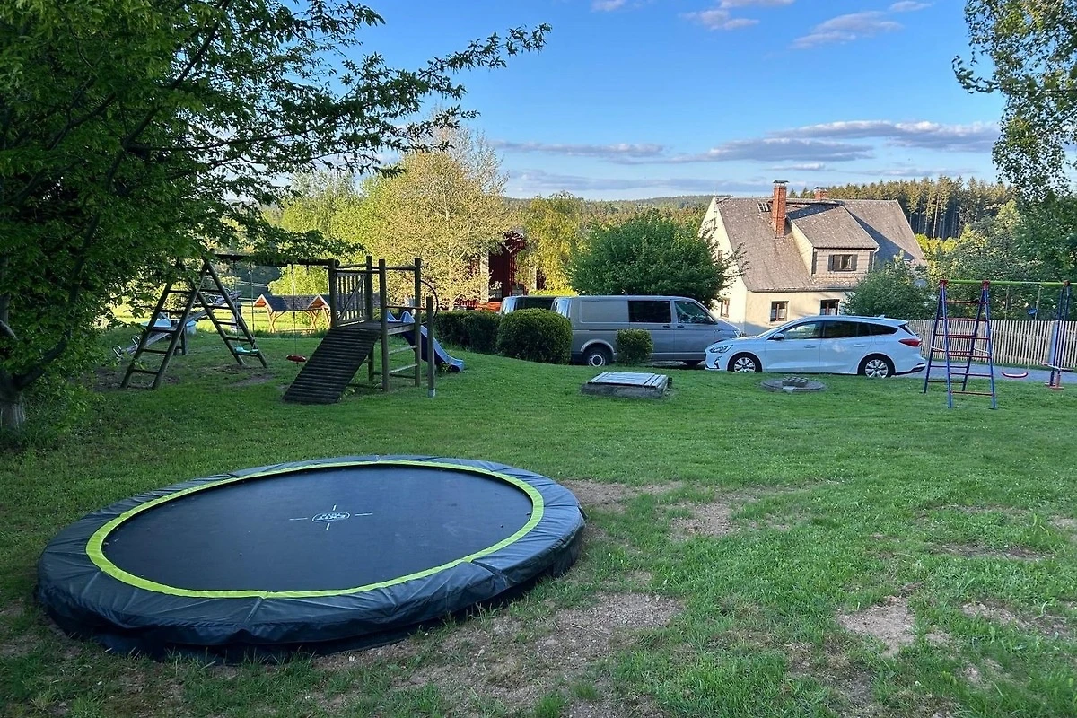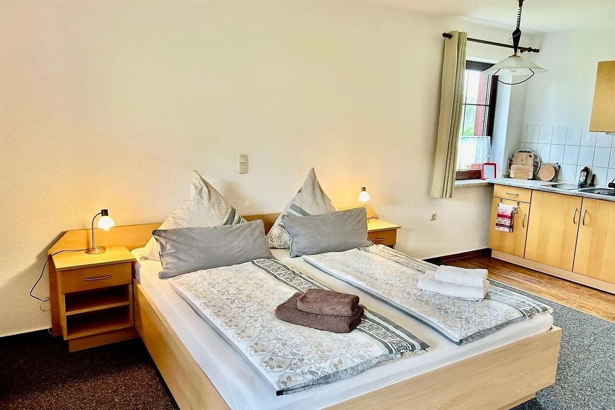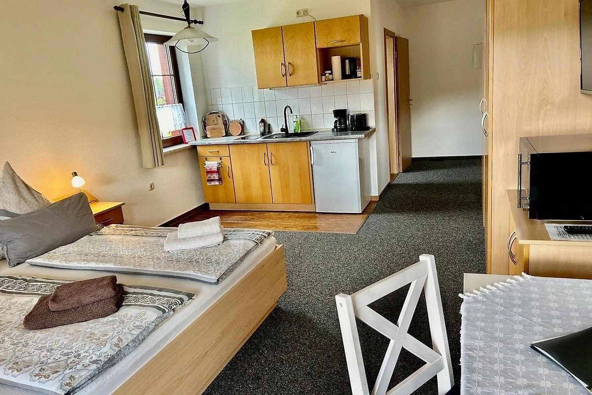 Unsere Familie heisst Sie beim Gästeliebling Vogtland 2023 + 2024 in liebevoll eingerichteten Ferienwohnungen mitten im wunderschönen Vogtland willkommen. FeWo 3 ist eine Ein-Raum-FeWo mit Küchenzeile, Essecke, Flachbildschirm, Tageslicht-Badezimmer mit Dusche und Balkon.Diese FeWo ist ebenerdig vom Parkplatz erreichbar und für Personen mit Rollator geeignet.Wir stellen Ihnen je Person 1 x Bettwäsche und 2 Handtücher.Pool, Sonnenterrasse, Spielplatz, Parkplatz, WLAN, Grillplatz-Nutzung sind inklusive. Bei uns können Sie in ruhiger Lage entspannen und die Natur auf Spaziergängen und Fahrradtouren geniessen. Für Familientreffen, gemeinsame Mahlzeiten, Geburtstagsfeiern oder ähnliche Veranstaltungen bieten wir Ihnen unsere Pumphut`s Stube an. Hier finden bis zu 24 Personen Platz.Diese berechnen wir separat mit einer einmaligen Gebühr von 50,- Euro (Reinigungs-/Nutzungsgebühr).Für die kalte Jahreszeit bieten wir Ihnen unsere Sauna an.Diese berechnen wir separat und vor Ort mit 7,50 Euro/Person.Der Plohn-Freizeitpark liegt nur ca. 1 km entfernt.DTV-Klassifizierung bis Ende 2028 - 3 Sterne.