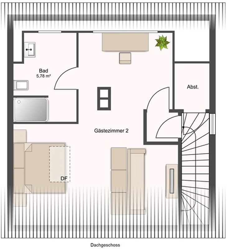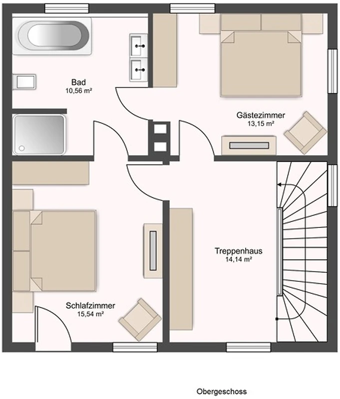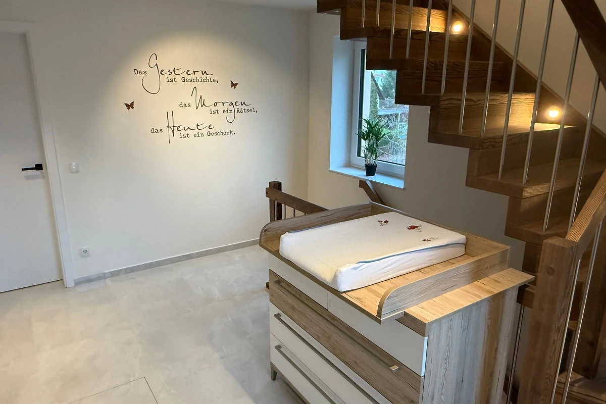 Das Schlafzimmer im OG liegt in Richtung Osten, so dass Sie jeden Morgen von der Sonne geweckt werden können. Ein weiteres Gästezimmer ist auf derselben Etage.