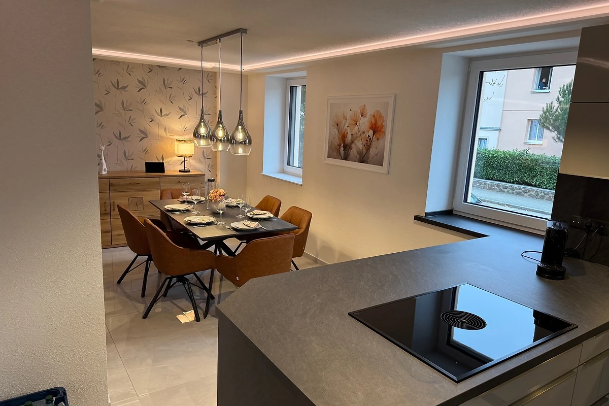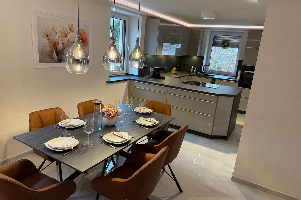 Die moderne Küche mit ihrer Insel grenzt an den Wohn/Essbereich an und lädt zum gemeinsamen Kochen ein.