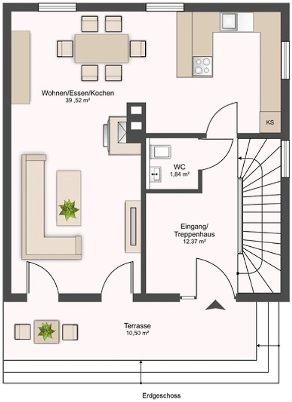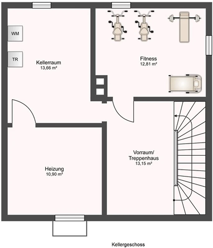 Im Kellergeschoss gibt es einen kleinen Fittnessraum und eine Wäscheraum mit Waschmaschine und Trockner.
