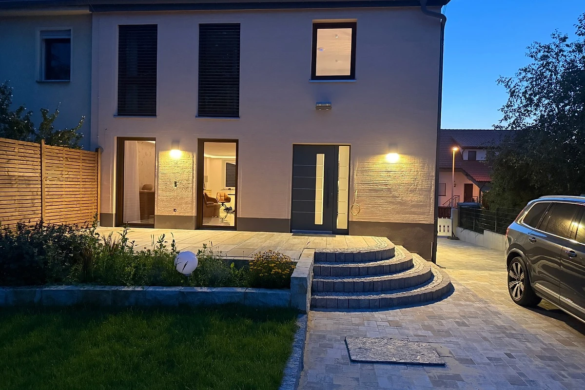 Der komplett umfriedete Aussenbereich ist ähnlich einem Patio angelegt und hält für Sie einen 3,5 x 7m Pool mit Loungeecke, eine Aussenküche mit Grill sowie eine separate Aussensauna bereit. Am Doppelcarport gibt es Lademöglichkeiten für ihr E-Autos (46ct/kwh) und ihre E-bikes.