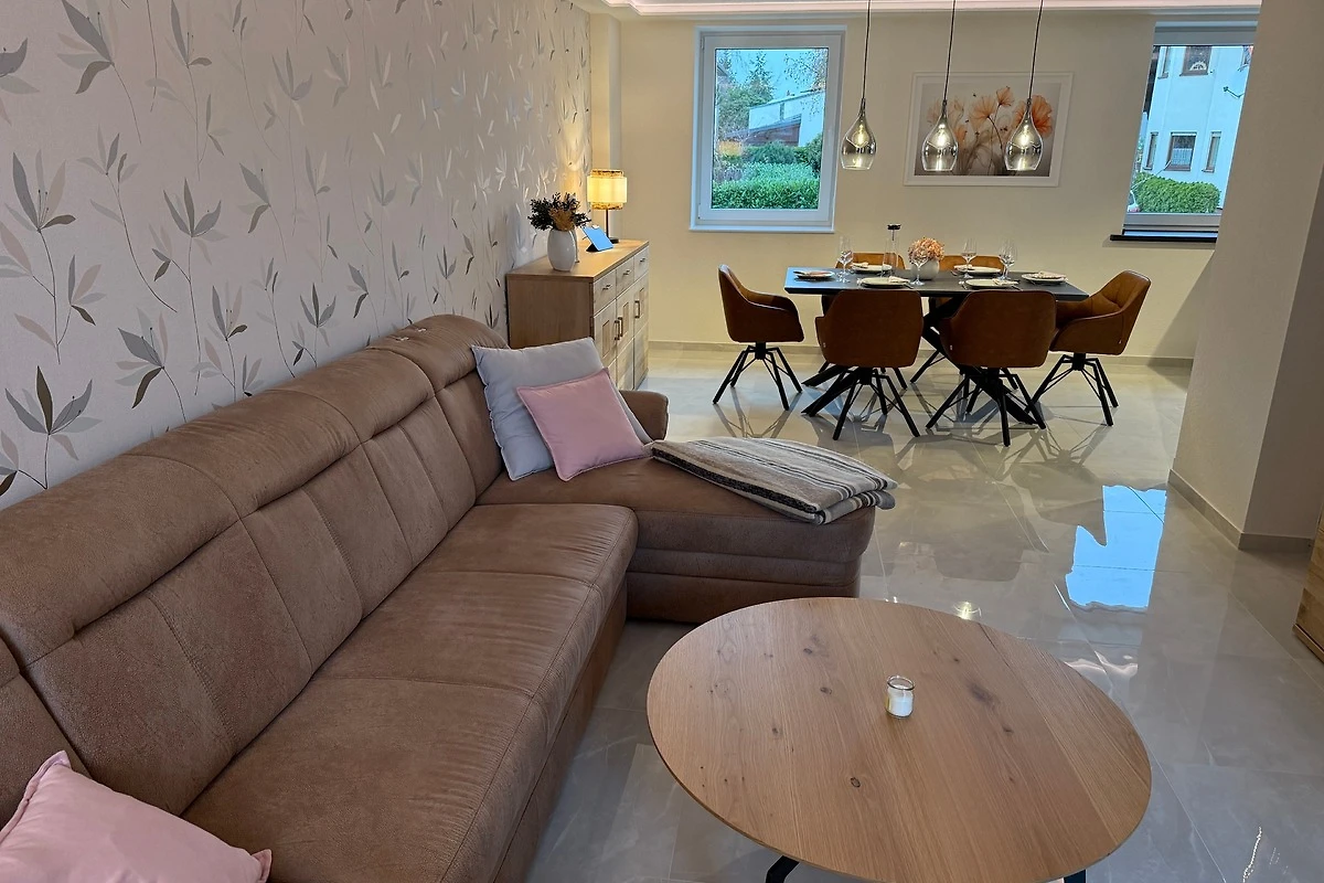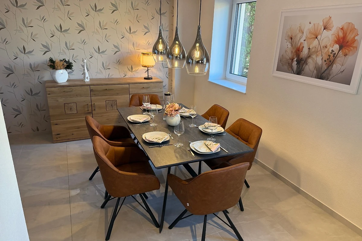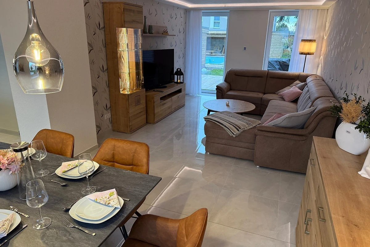 Der gut geschnittene und sehr bequeme eingerichtete Wohn/Essbereich bildet das Herzstück des schönen Ferienhauses, die einladende Süd/Ostterrasse mit Sitzgruppe betreten Sie stufenlos aus dem Wohnzimmer.