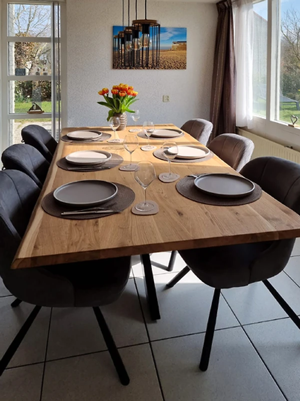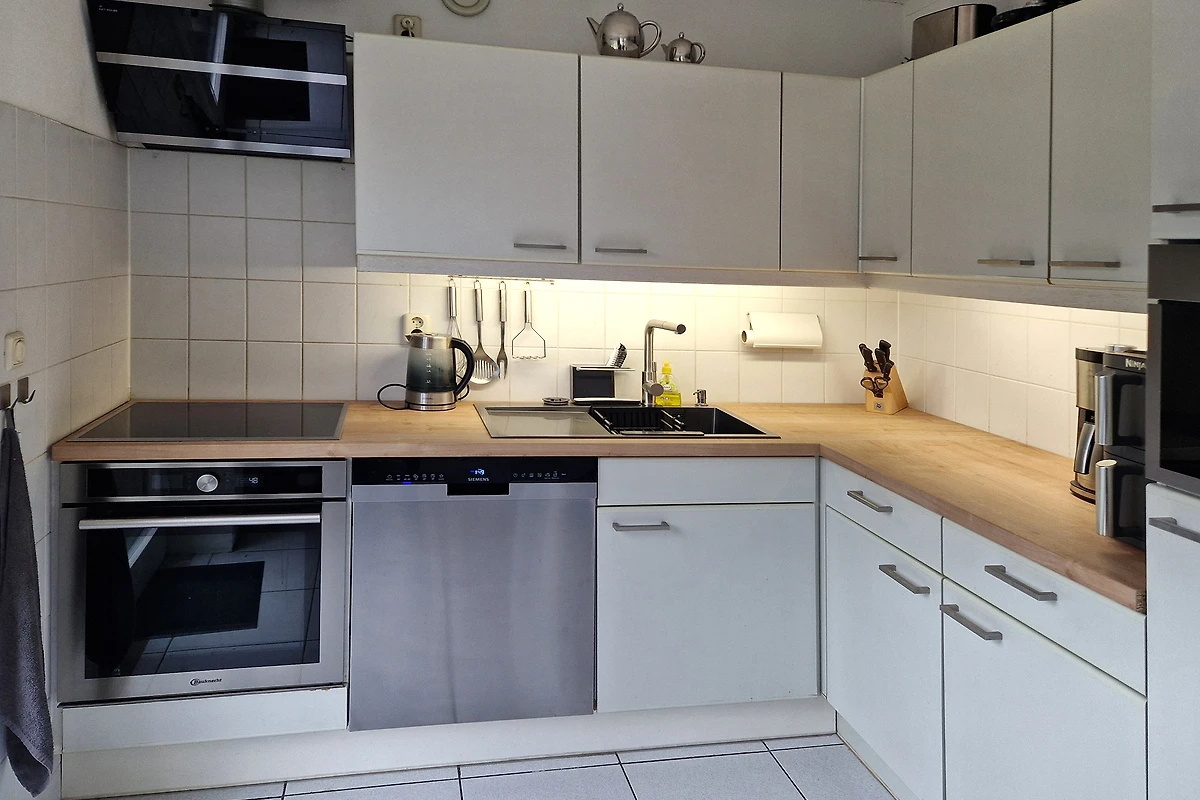 Vom Essbereich aus haben Sie direkten Blick auf die gut ausgestattete, offene Küche. Die Küche verfügt über einen Induktionsherd, einen Backofen, einen Airfryer, einen Geschirrspüler, eine Mikrowelle, eine Filterkaffeemaschine sowie eine Senseo- und Nespresso-Kaffeemaschine und alle gängigen Küchenutensilien.