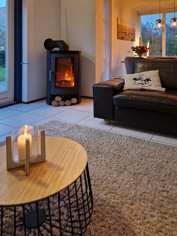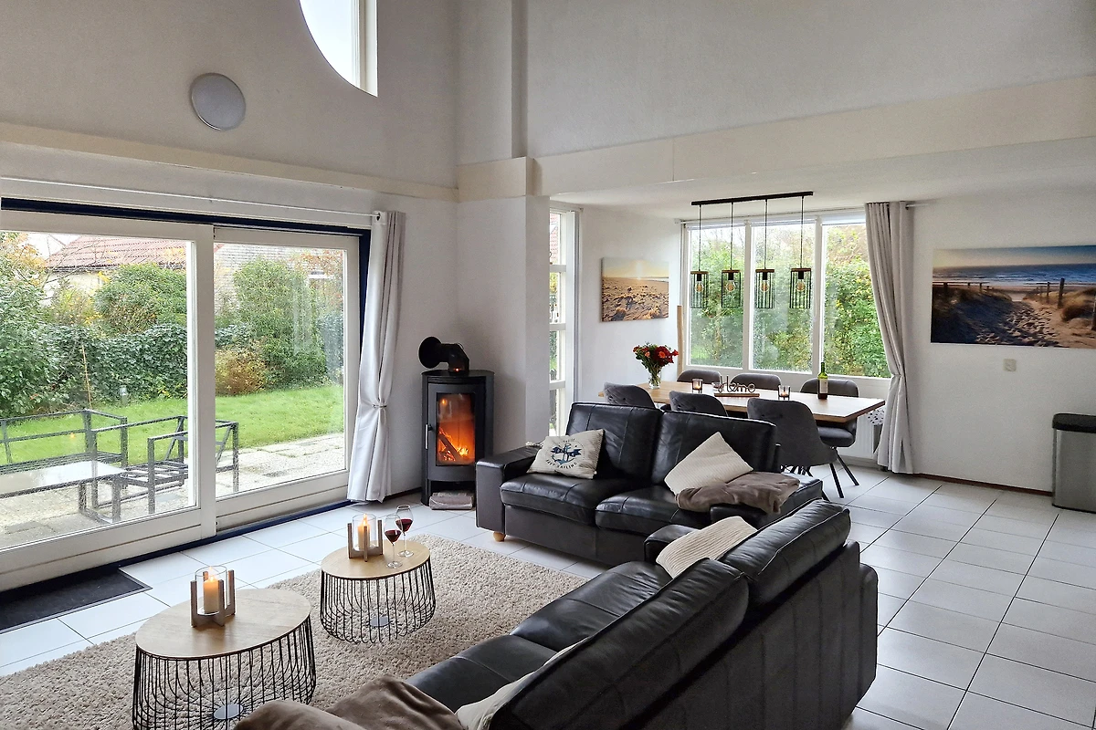 Beim Betreten gelangen Sie über den Flur in das gemütliche Wohnzimmer. Dort befindet sich eine geräumige Sitzecke mit zwei bequemen Sofas, einem gemütlichen Holzofen und einem sehr geräumigen Essbereich.