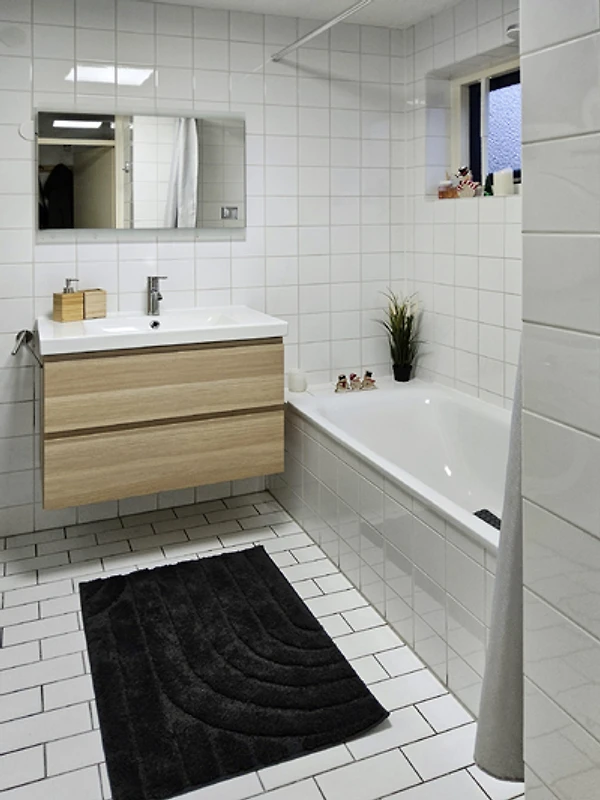 Angrenzend an den Flur befinden sich das Badezimmer, eine separate Toilette und ein geräumiges Schlafzimmer mit Doppelbett, Fernseher und ausreichend Stauraum. Die Wohnung verfügt über zwei Badezimmer. Im Erdgeschoss finden Sie ein Badezimmer mit Badewanne/Dusche und Waschbecken. Im Obergeschoss befinden sich eine begehbare Dusche und eine zusätzliche Toilette. Über die Treppe gelangen Sie in das Obergeschoss, wo sich die beiden anderen Schlafzimmer und das zusätzliche Badezimmer befinden. Beide Schlafzimmer verfügen über ein Doppelbett und haben nur Internetanschluss für den Fernseher. Im Abstellraum im Freien stehen eine Waschmaschine und ein Trockner zur Verfügung.