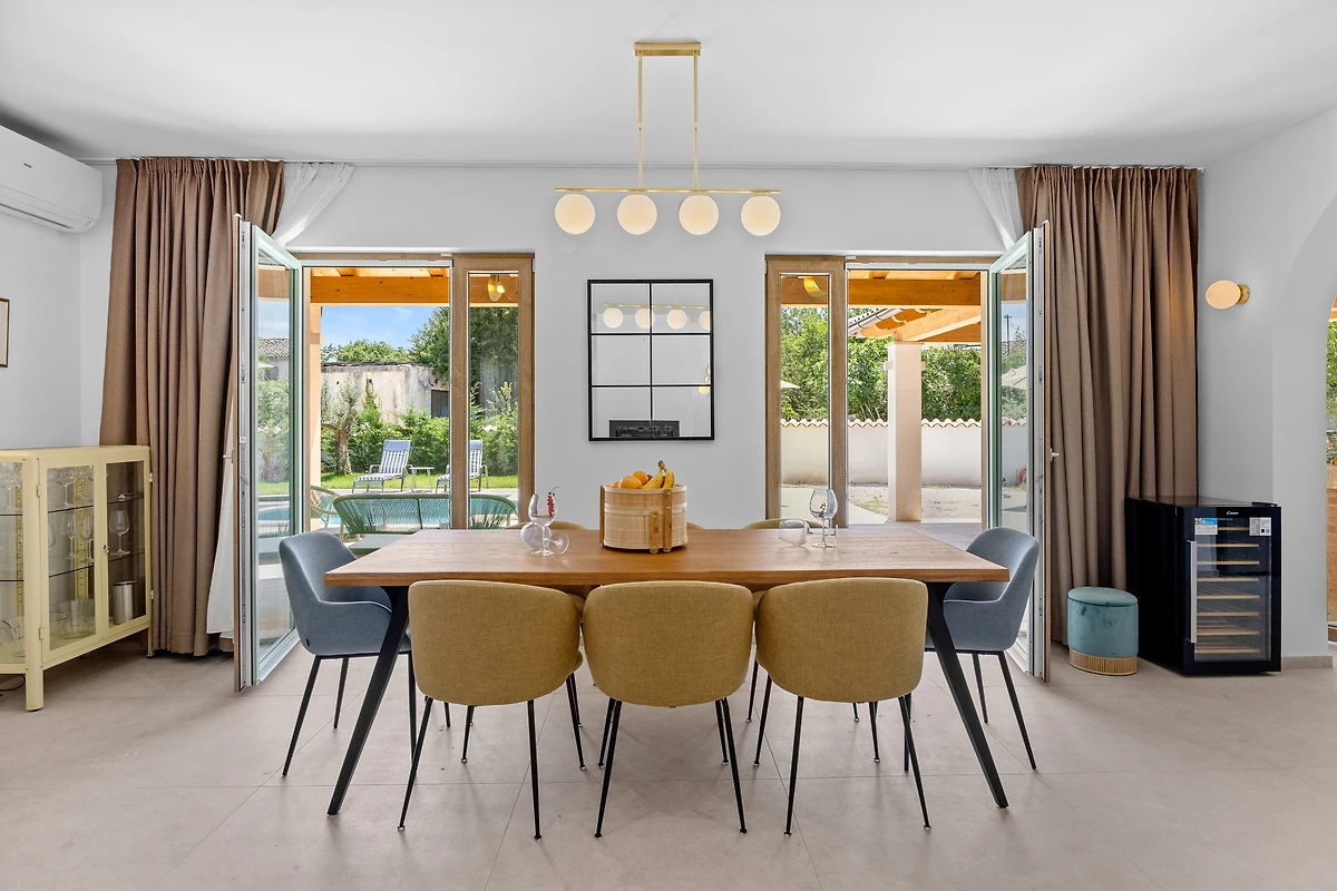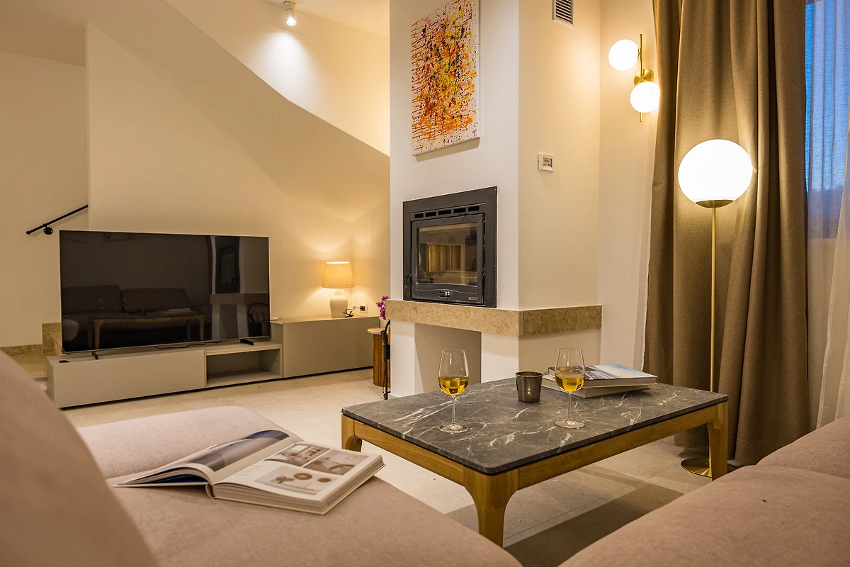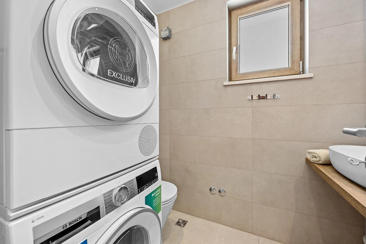 Der Wohnbereich punktet mit einem stilvollen Kamin und Klimaanlage für angenehmes Raumklima. Die bestens ausgestattete Küche verfügt über eine Küchenzeile, Geschirrspüler, Mikrowelle, Wasserkocher und Kaffeemaschine. Eine Waschmaschine, Trockner, Bügeleisen sowie Föhn sind vorhanden. Für Familien stehen ein Babybett und ein Hochstuhl bereit. Bettwäsche, TV und WLAN sorgen für zusätzlichen Komfort.