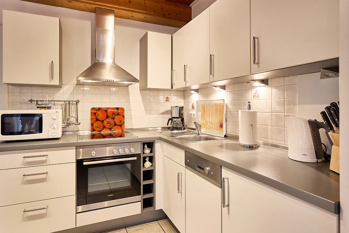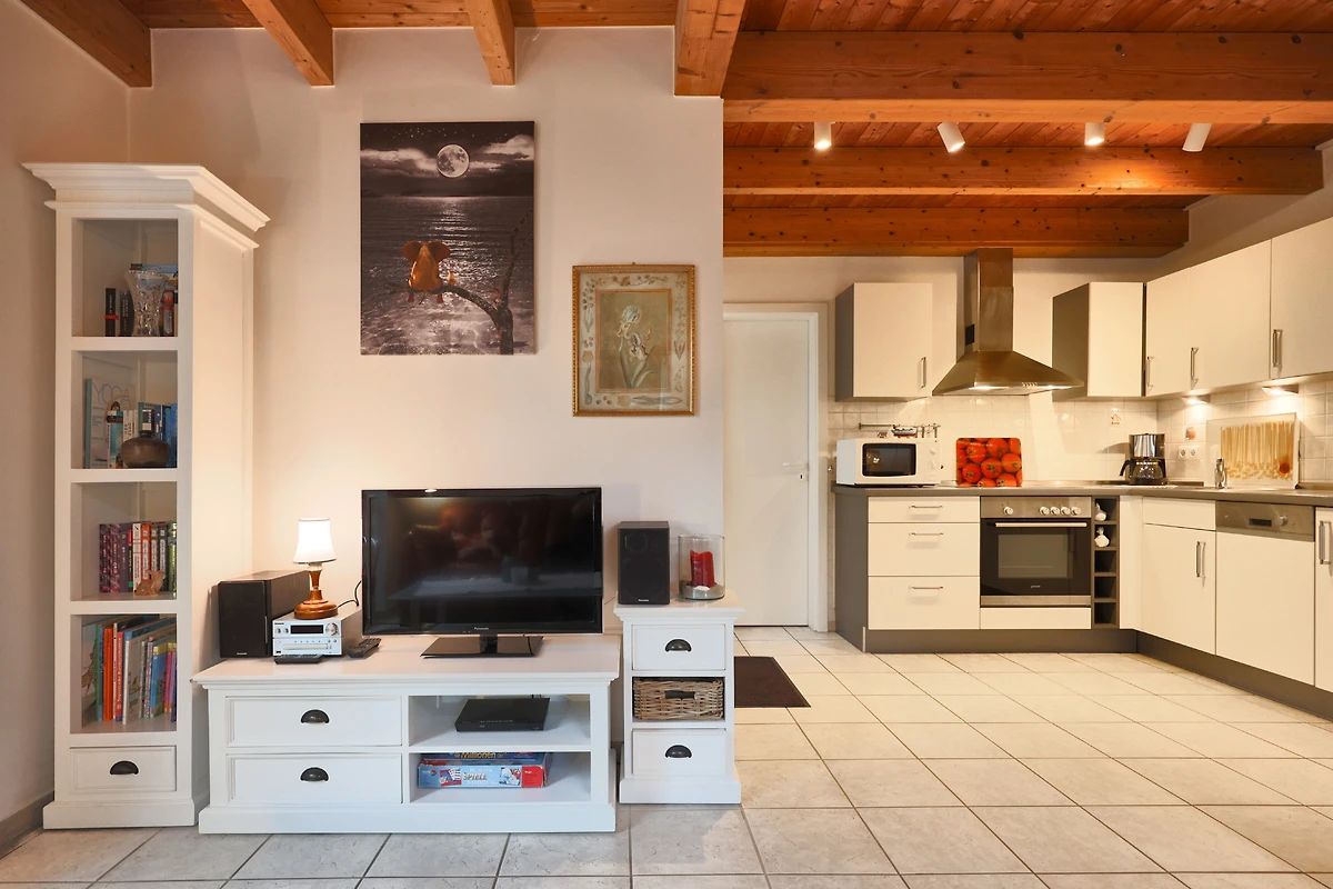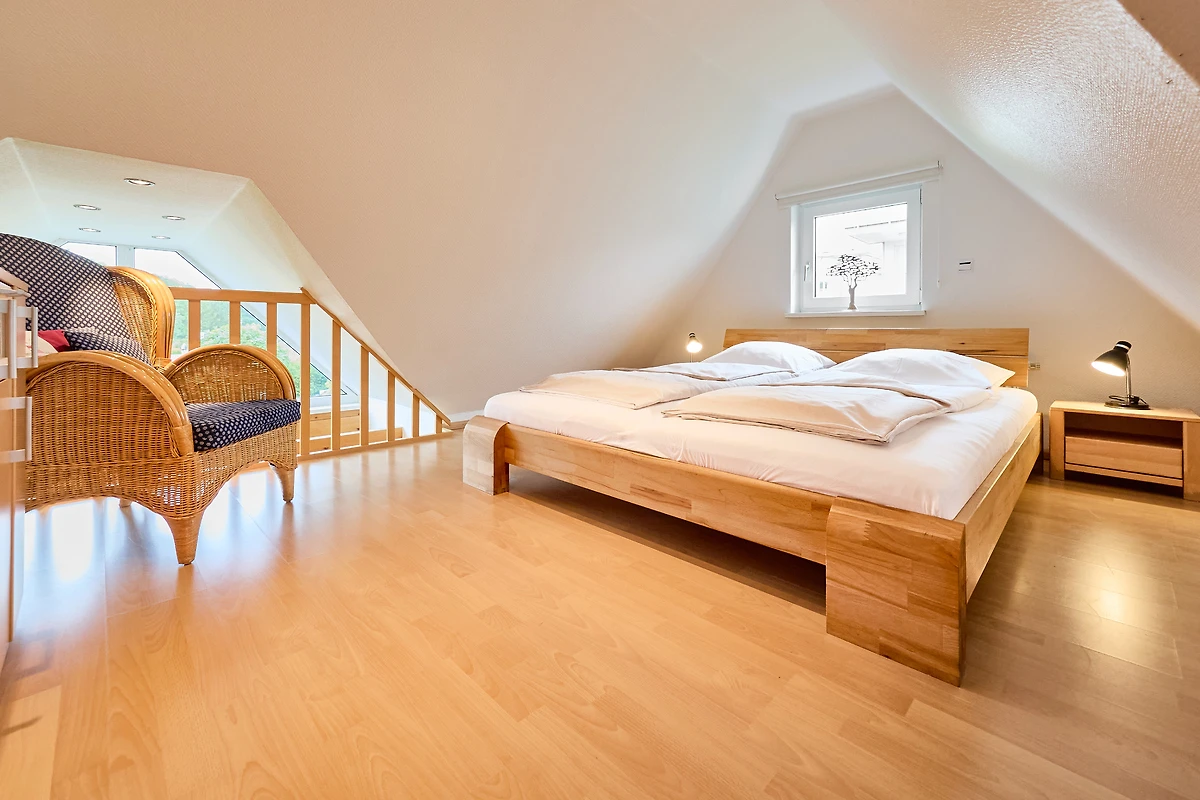 Die 2-Zimmerhaushälfte besteht aus einem großen Wohn-und Essbereich. Im Erdgeschoss befindet sich auch eine voll ausgestattete Einbauküche inkl. Geschirrspüler sowie ein großzügiges Duschbad. Im Obergeschoss gibt es ein Schlafzimmer mit Doppelbett (neue rückenfreundliche Matratzen) und 1 Einzelbett (90x200cm) sowie einen Spielboden. Vor dem Haus finden Sie einen privaten Stellplatz für Ihren PKW. Dort gibt es auch eine Wallbox zum Laden von E-Autos (gegen Mehrpreis).