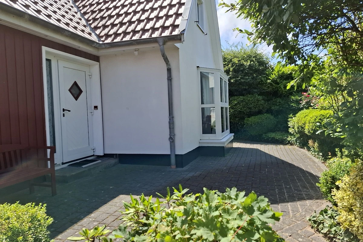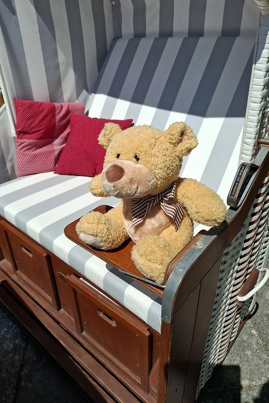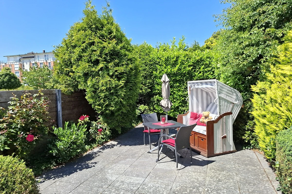 Sehr einladend ist die eigene Terrasse mit Strandkorb und Gartenmöbeln, die Sie bei schönem Wetter ausgiebig genießen können. Auch Ihre Kinder finden hier viel Platz zum Spielen.
