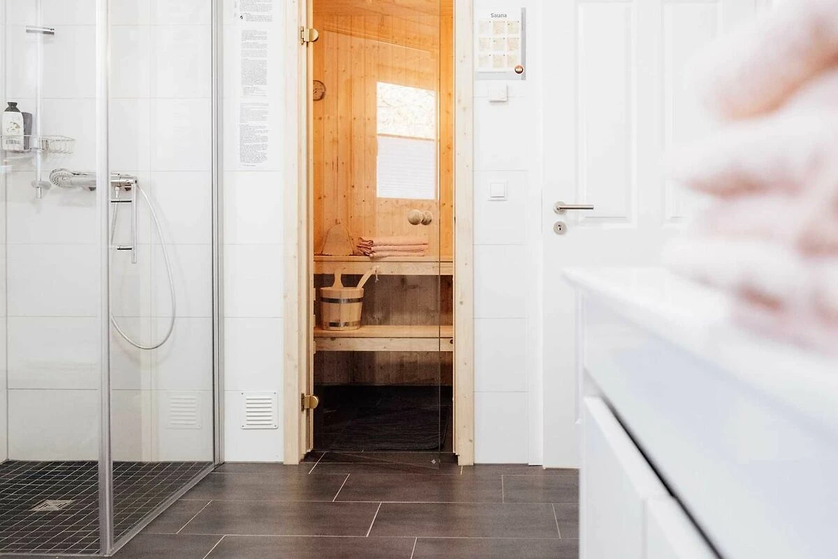 Lassen Sie im Wellnessbad mit Sauna, Whirlpool und bodengleicher Dusche nach einem ereignisreichen Tag die Seele baumeln. Das moderne Badezimmer verspricht Entspannung pur!