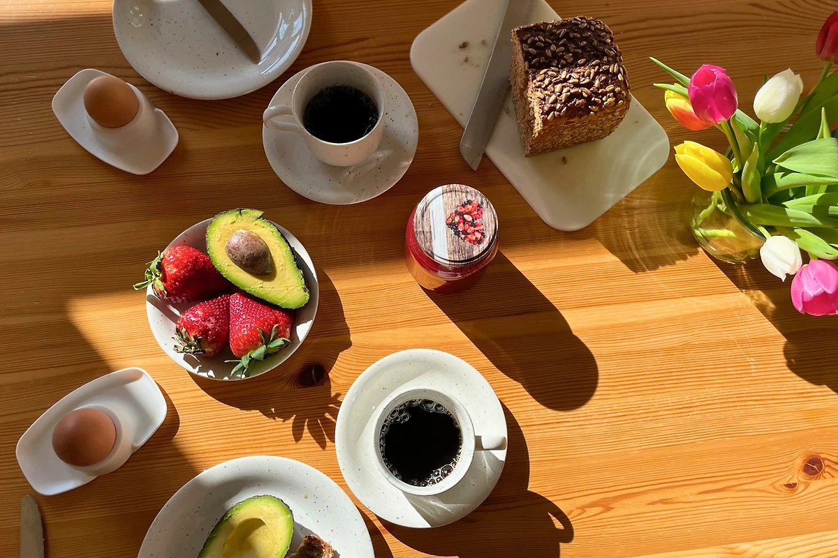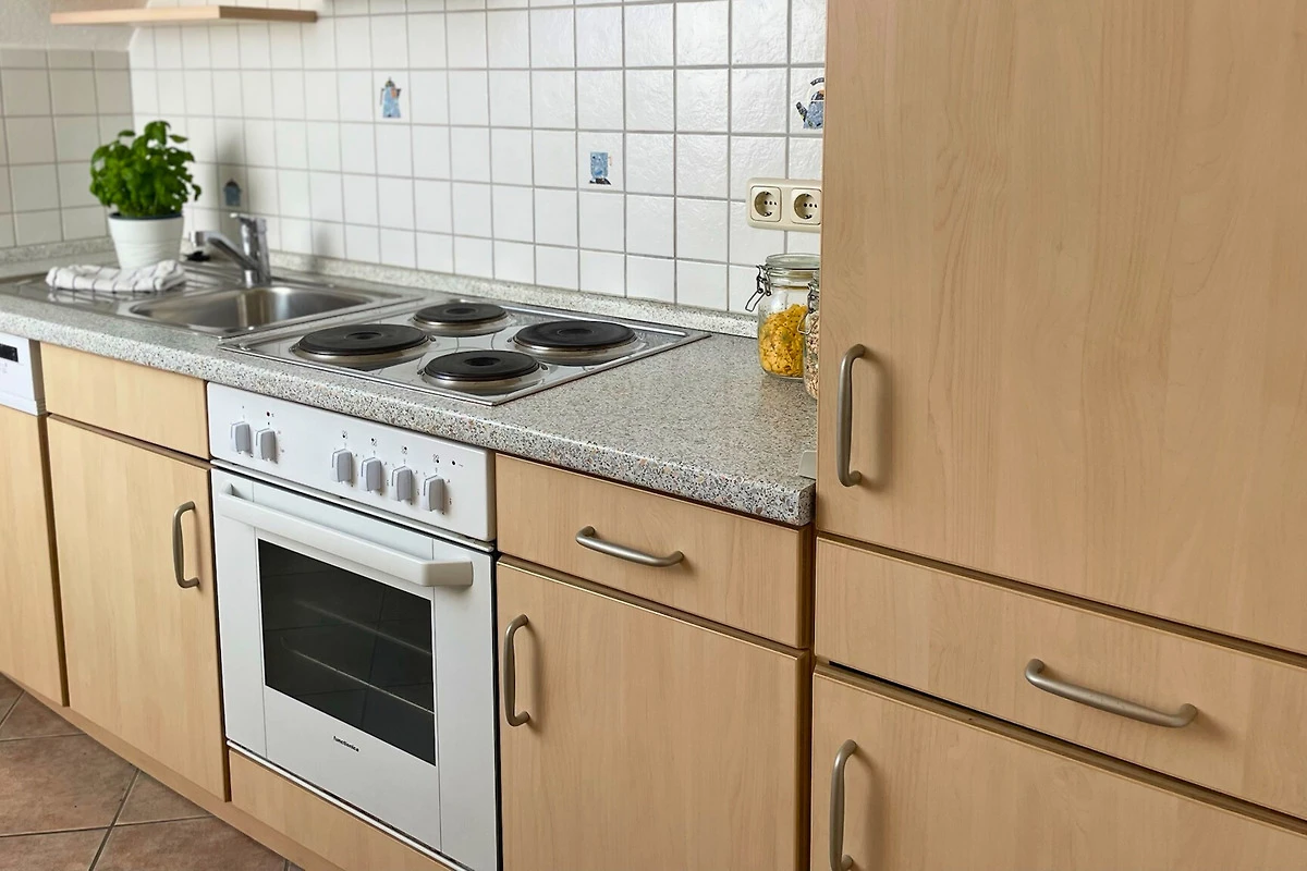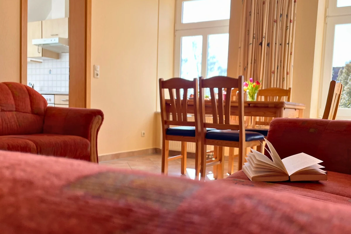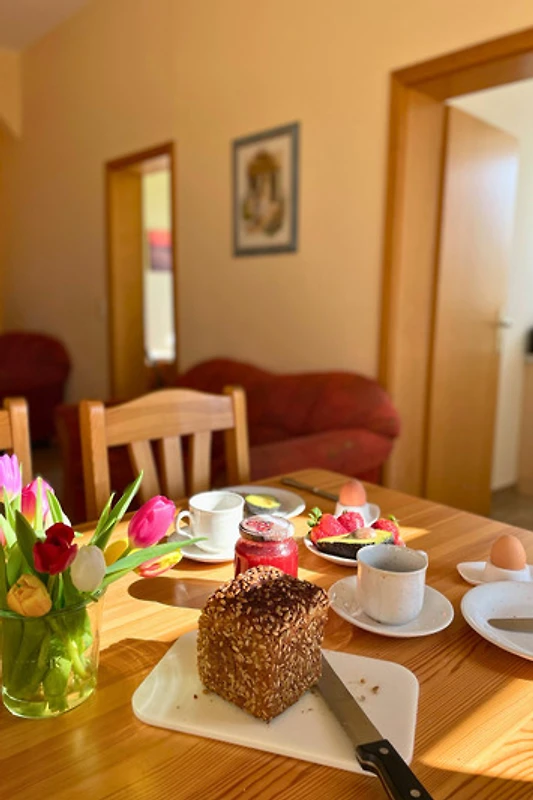 Der Wohn- und Essbereich ist offen und gemütlich miteinander verbunden – der perfekte Ort für gemeinsame Stunden. Ob entspannt auf der Couch oder beim gemeinsamen Essen am Tisch, hier lässt es sich gut leben. Die Küche ist voll ausgestattet, sodass du alle Mahlzeiten ganz nach Lust und Laune zubereiten kannst.