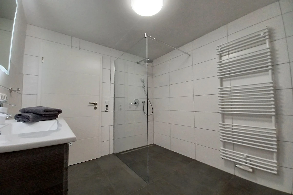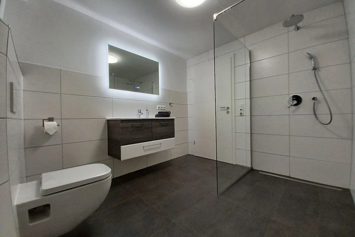 Das Badezimmer ist eine moderne Wohlfühloase mit einer grossen begehbaren Regendusche (1,10 x 1,20 m).