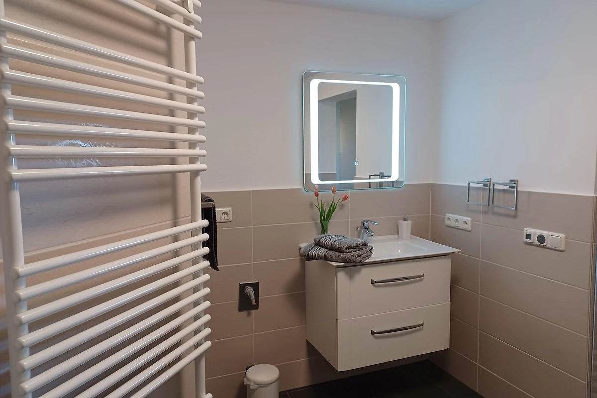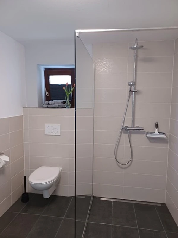 Das Badezimmer ist eine moderne Wohlfühloase mit einer grossen begehbaren Regendusche (1,10 x 1,20 m).