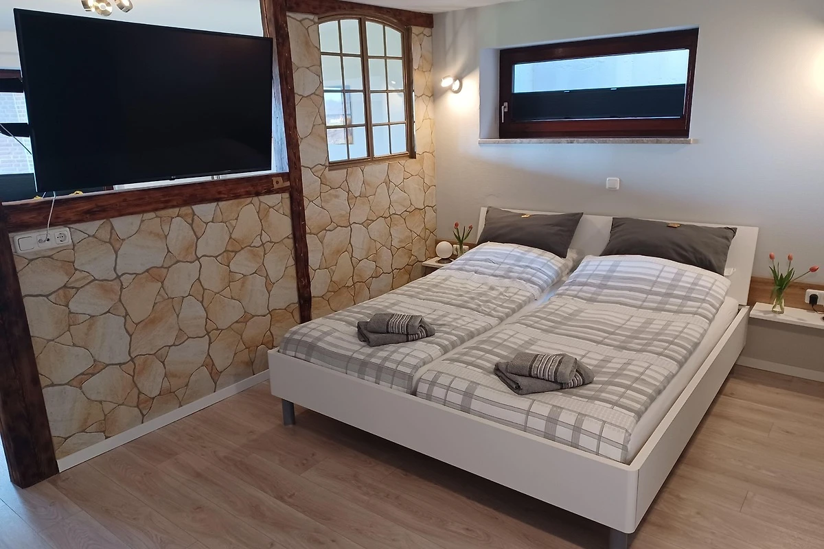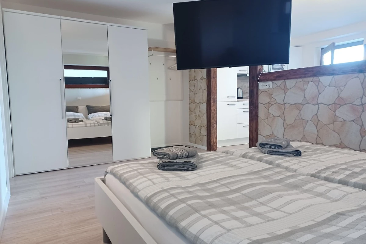 Wer seinen Abend lieber entspannt bei einem Glas Wein und einem Tatort oder Blockbuster ausklingen lassen möchte, der kann dies auf der gemütlichen Couch im Wohnbereich oder auch vom Bett aus im Schlafbereich dank des grossen schwenkbaren 55-Zoll TVs tun. Der Schlafbereich ist weiterhin mit einem 1,80 x 2,00 m grossen Doppelbett sowie einem geräumigen Kleiderschrank und einer Garderobe ausgestattet.
