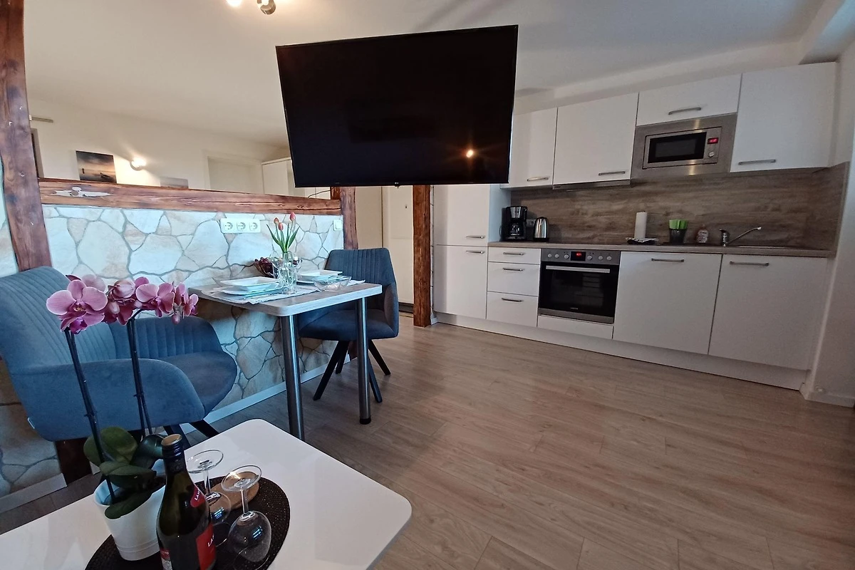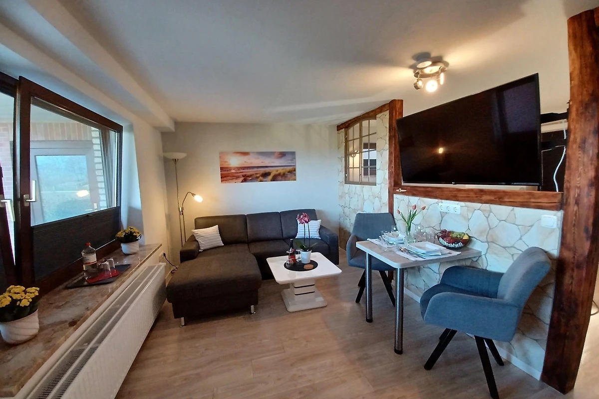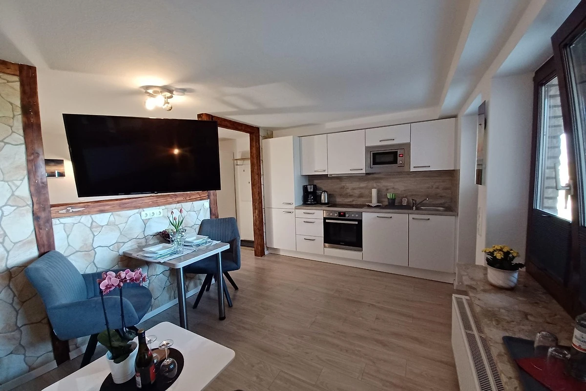 "Landlust" bietet einen hübschen Wohn- und Essbereich, der zum Verweilen auf der Couch oder mit seiner vollausgestatteten Küche zu ausgiebigen Kochabenden einlädt.