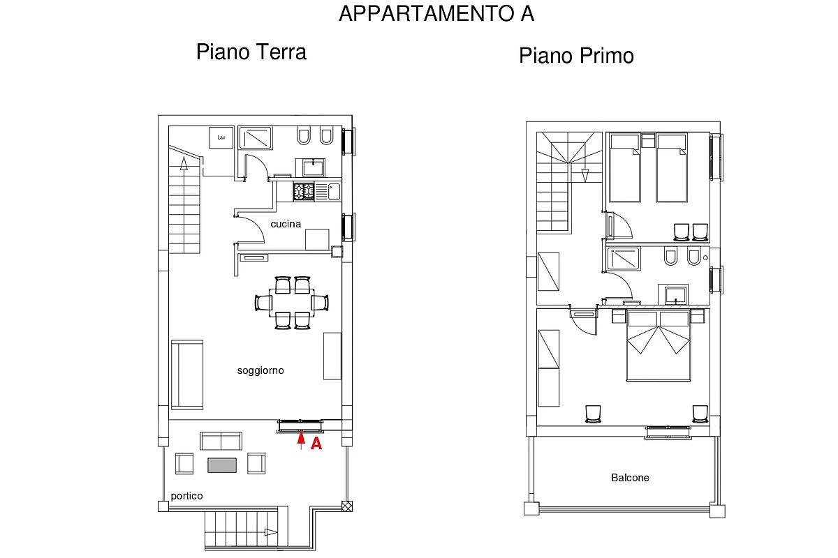 Apartment A, das 4/6 Personen beherbergen kann, erstreckt sich über zwei Etagen. Der Wohnbereich befindet sich im Erdgeschoss (Veranda, Wohnzimmer mit Schlafsofa, Küche, Bad, Hauswirtschaftsraum), und der Schlafbereich befindet sich im ersten Stock (Doppelzimmer, Zweibettzimmer, Bad, Balkon).